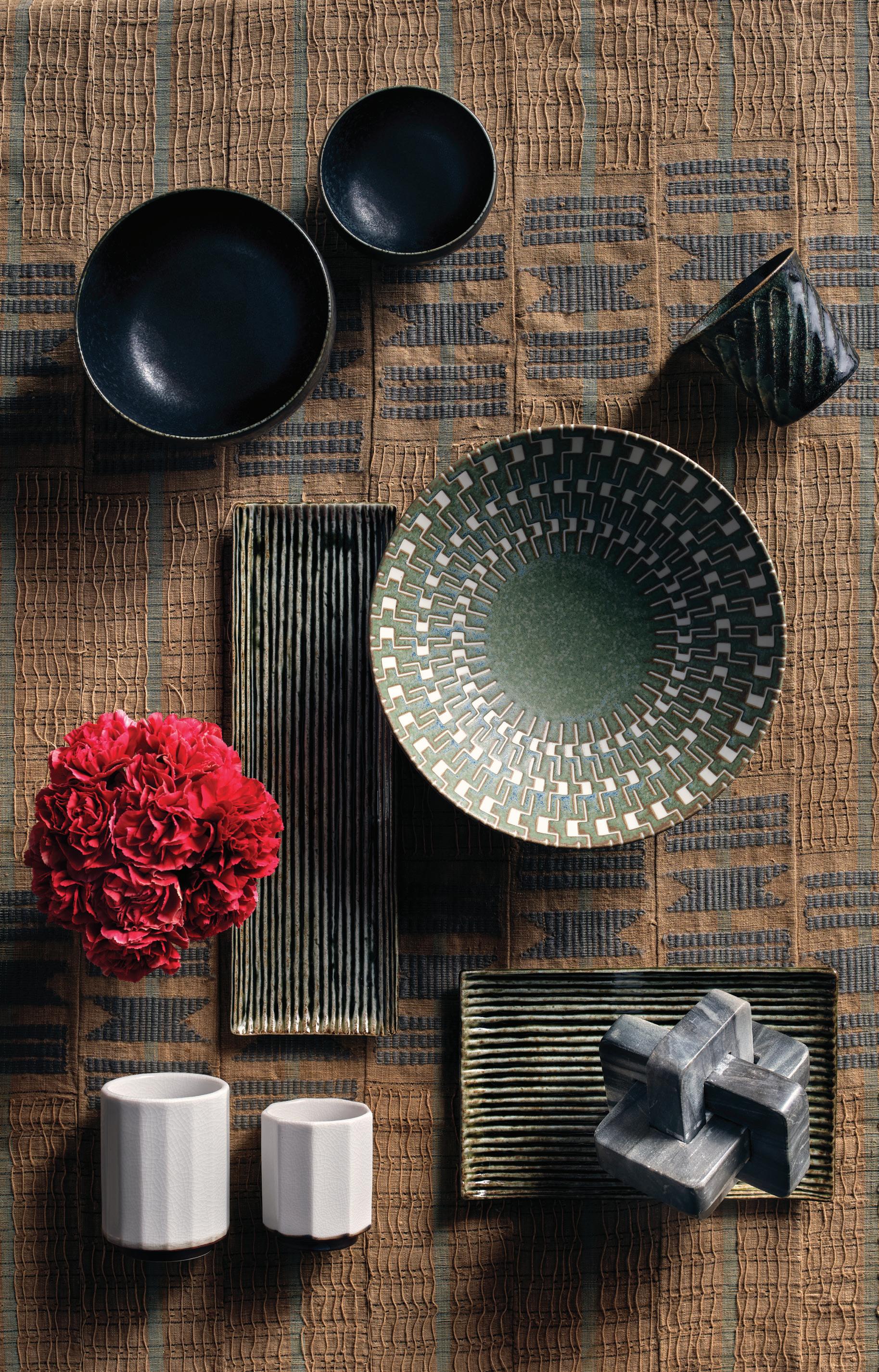 THIS PAGE: ASTIER DE VILLATTE CERAMICS starting at $90 glazed terracotta • VINTAGE YORUBAN TEXTILE $550 hand loomed cotton OPPOSITE PAGE: RIVINGTON CHAIR $3,295 slipcovered in pavilion-terracotta linen