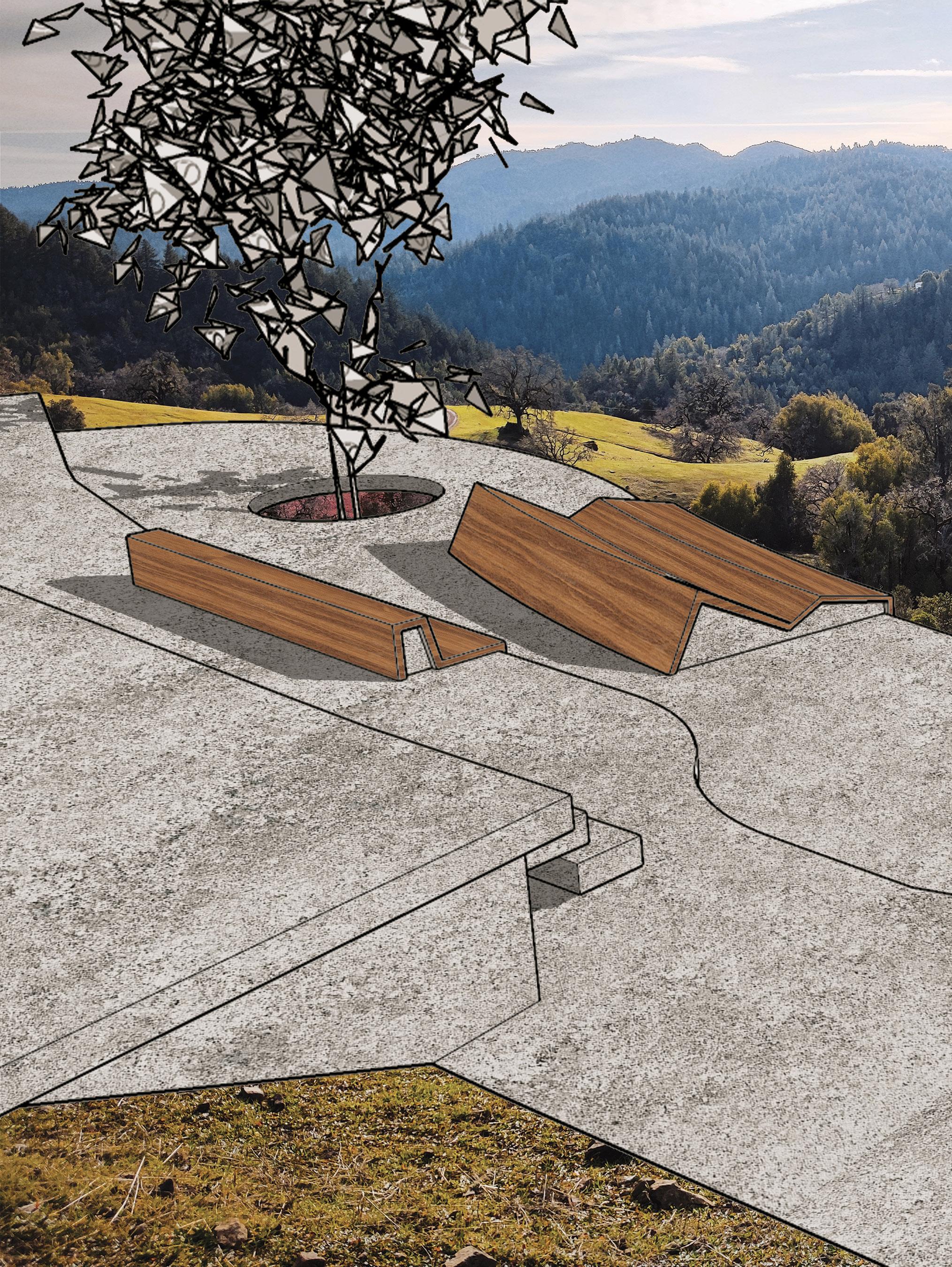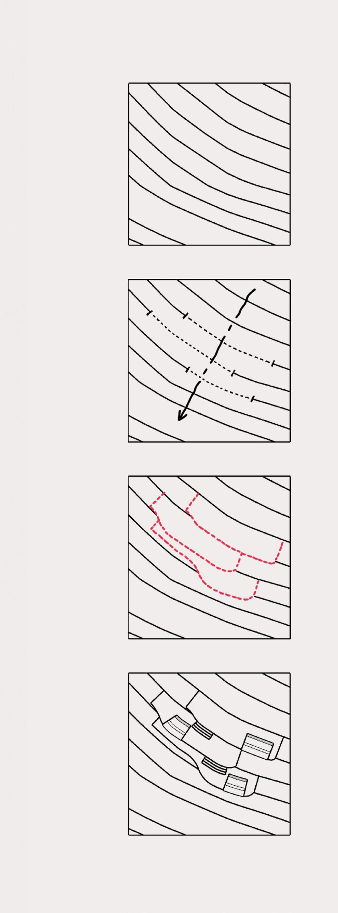 FOR THIS DETAILED LANDSCAPE DESIGN IN TERVANA, THE INTENTION IS TO FOCUS ON THE RELATIONSHIP BETWEEN BUILT STRUCTURE AND NATURAL TOPOGRAPHY. THE CONCEPT OF THE PROJECT COMES FROM A LOOK-OUT DESIGN THAT IS BREAKING OUT FROM A WALL ALONG THE WALKWAY, CREATING A SUPRISING VIEW FROM THE GAP. THEREFORE, IN THIS VIEWPOINT DESIGN, I AM TRYING TO USE THE SAME CONCEPT TO BREAK THROUGH THE CONTOUR LINES.
