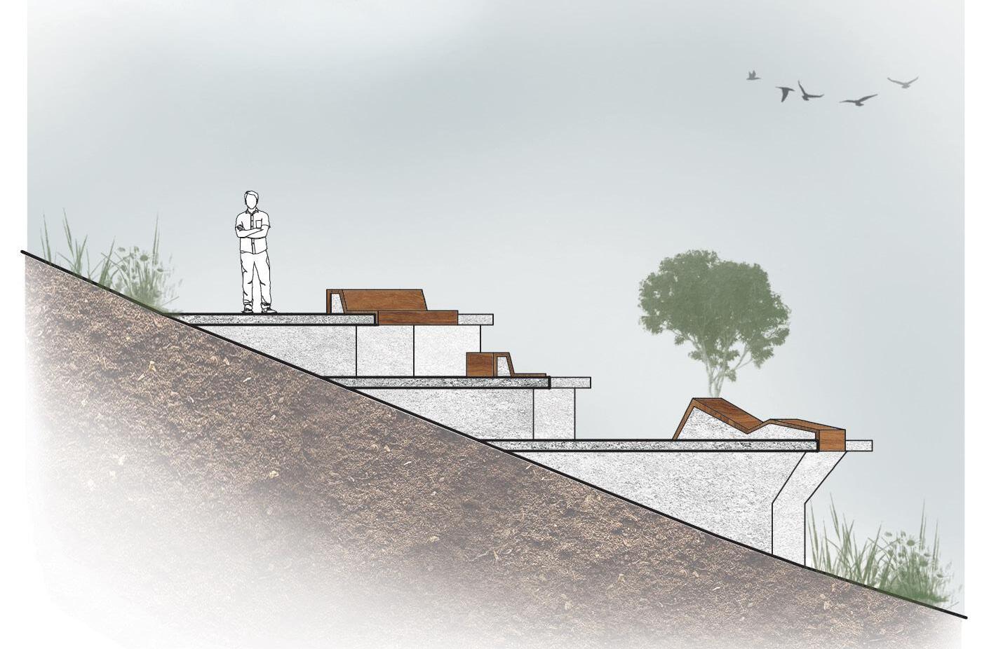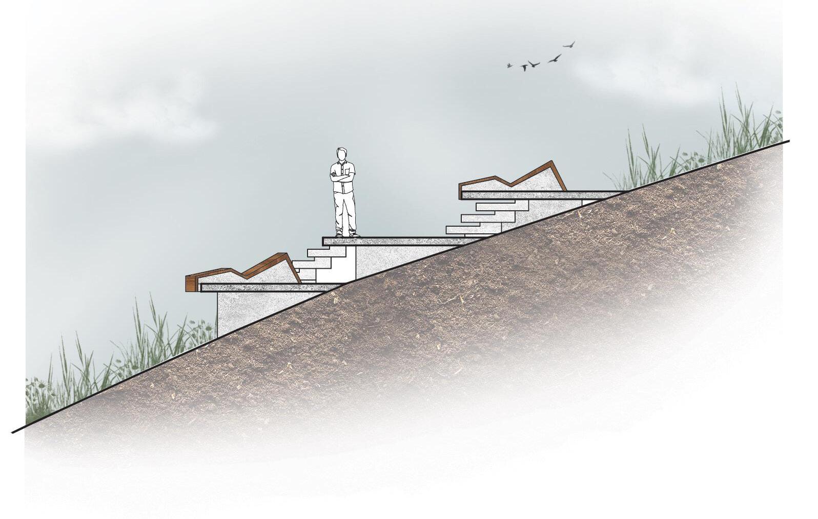CONTOUR LINES, WE ARE ABLE TO FOR PEOPLE TO STAY AND SAME TIME, THE SHAP OF ARE PARTIALLY FOLLOWING WHICH HELPS THE STRUCTBETTER BLEND IN WITH THE SURROUNDING LANDSCAPE.