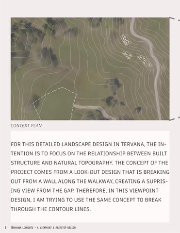 FOR THIS DETAILED LANDSCAPE DESIGN IN TERVANA, THE INTENTION IS TO FOCUS ON THE RELATIONSHIP BETWEEN BUILT STRUCTURE AND NATURAL TOPOGRAPHY. THE CONCEPT OF THE PROJECT COMES FROM A LOOK-OUT DESIGN THAT IS BREAKING OUT FROM A WALL ALONG THE WALKWAY, CREATING A SUPRISING VIEW FROM THE GAP. THEREFORE, IN THIS VIEWPOINT DESIGN, I AM TRYING TO USE THE SAME CONCEPT TO BREAK THROUGH THE CONTOUR LINES.