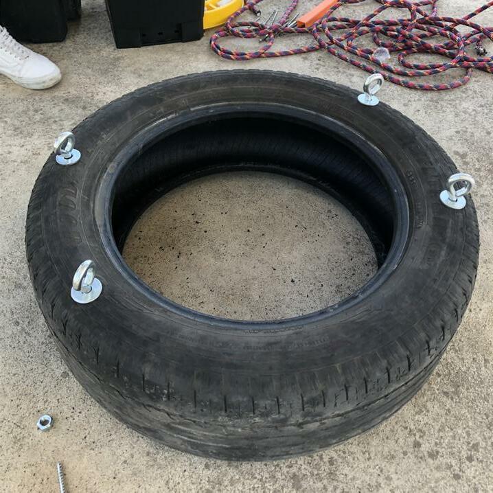 Con pedacería de tabla de madera, se realizó una superficie circular de 50 cms de diámetro, para cubrir el hueco del neumático que servida como asiento del columpio. Teniendo ya cortada esta tabla circular de madera, se fija al neumático por medio de pijas de 1 ¼”, que se colocan en todo el perí metro del hueco del neumático, teniendo la precaución de que dichas pijas sujeten neumático y madera, se colocan las pijas necesarias para obtener una fijación adecuada entre los dos materiales.