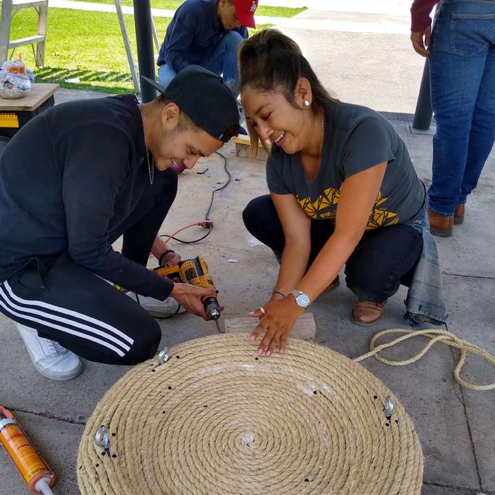 En este paso se pega el lazo de henequén al neumático comenzando desde el punto central de la base de madera que funcionara como asiento del columpio. Para realizar este paso es necesario ir colocando una capa de silicón blanco para comenzar a pegar el lazo en forma circular, hasta cubrir por completo el neumático.