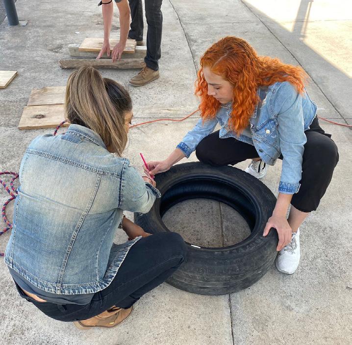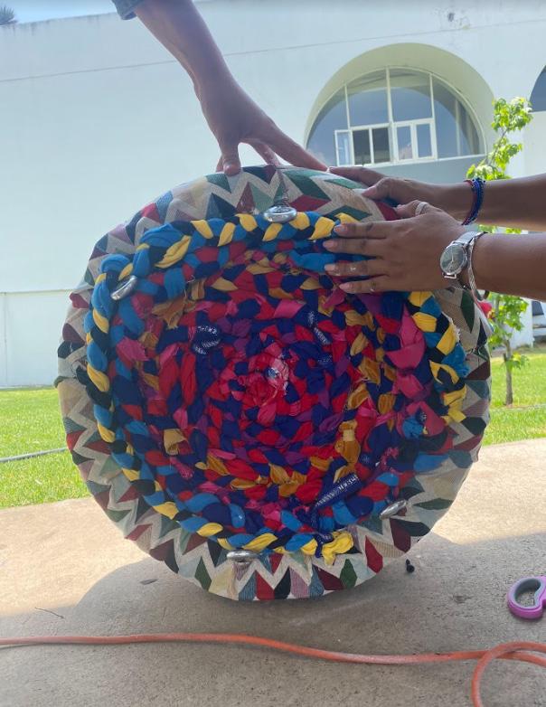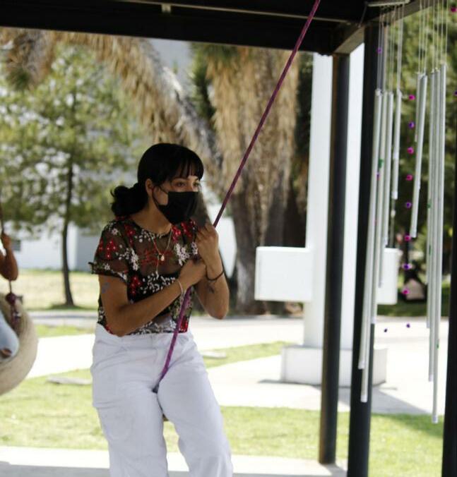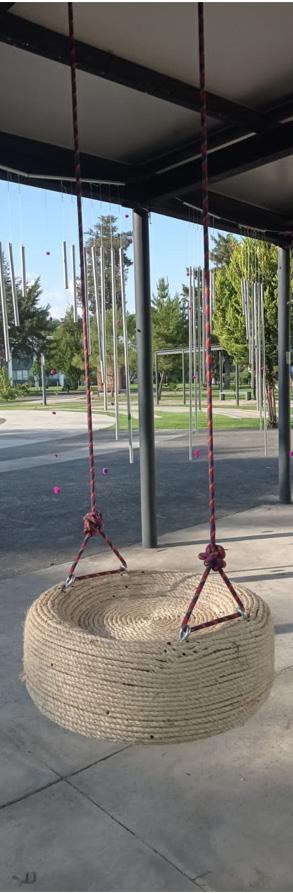 Columpios a base de reciclaje de llantas y otros materiales de refuerzo. Se trata de un objeto que permite la inclusión a través de la flexibilidad de uso recreacional, lectura, meditación, etcétera. Lo que a su vez contribuye a la salud mental.