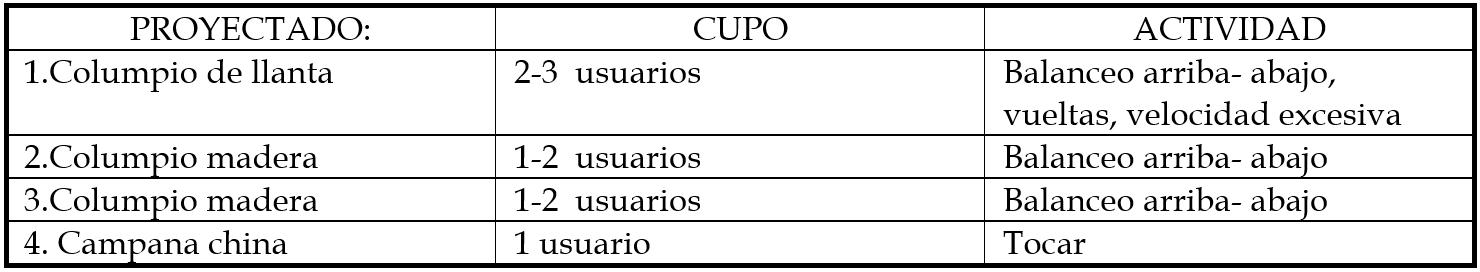 La realidad es que el columpio de llanta #1 es el que mayor uso rudo tiene, la carga del cupo excede y las formas de uso son variables, puede ser balanceo, vueltas, velocidad excesiva, los usuarios pueden estar sentados de pie o acostados. Posteriormente el columpio #2, #3 de madera también presenta sobrecarga de usuarios, mientras que las campanas son rara vez sonadas por los usuarios y el sonido es causado por el movimiento del aire.