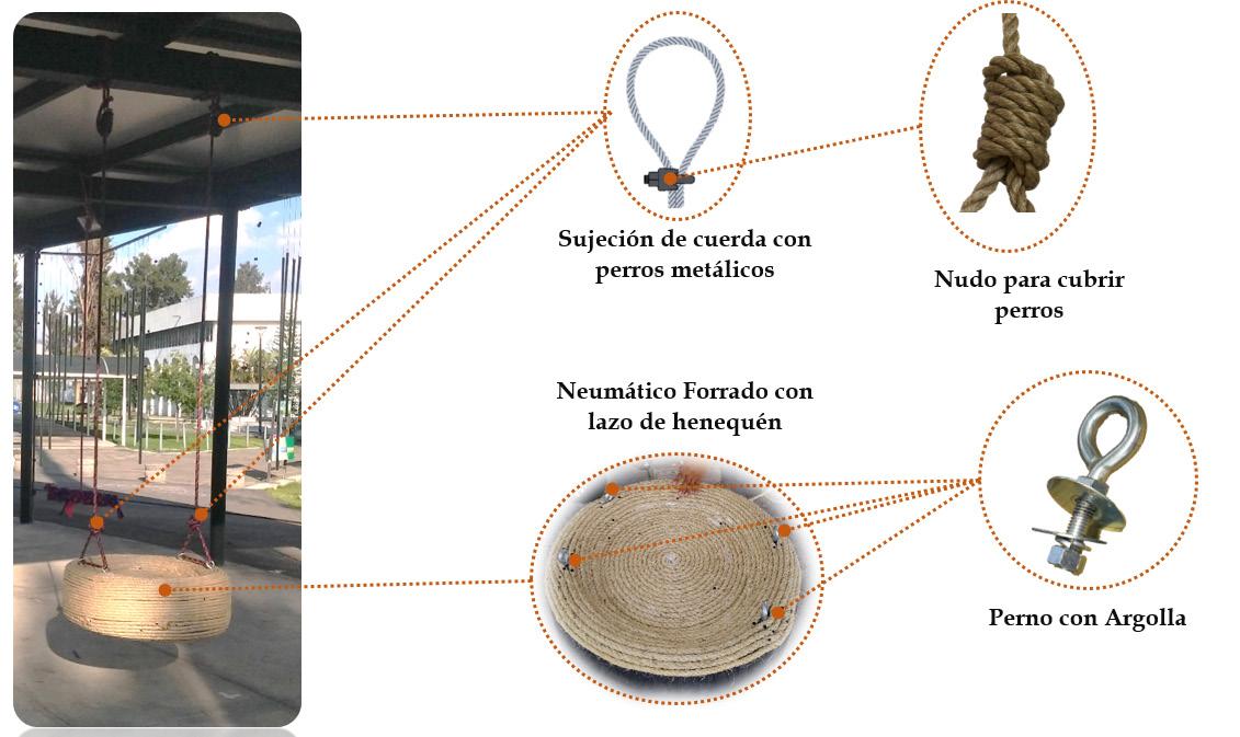 Por ultimo paso se cuelga el columpio por medio de los lazos de nailon, sujetándolo de las vigas de acero existentes utilizando un nudo de leñador, sujetando la misma cuerda de regreso con los perros metálicos para dar mayor seguridad al columpio, por ultimo se nivela el neumático del colum pio y se cubren los perros con un nudo denominado del ahorcado, con la finalidad de cubrir los perros y dar una apariencia mas estética al columpio.