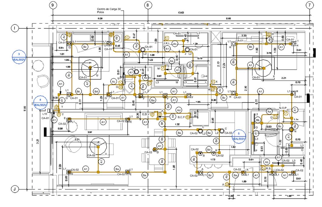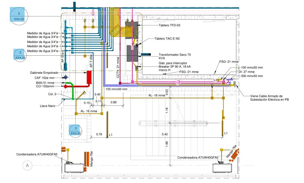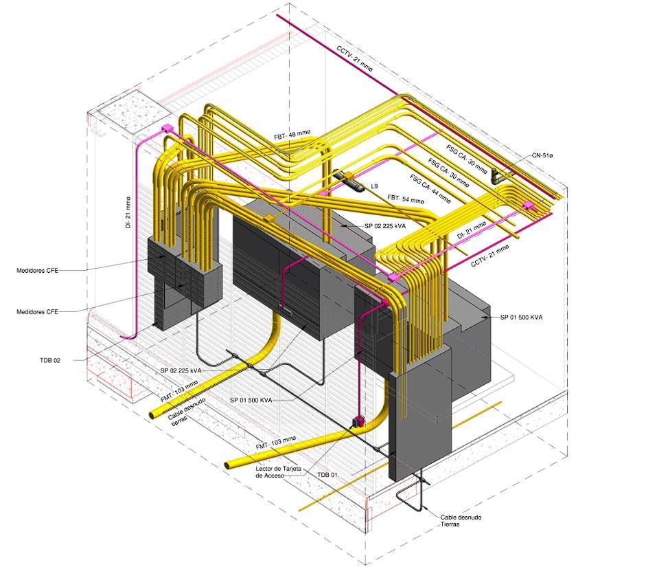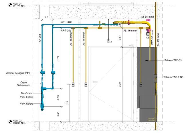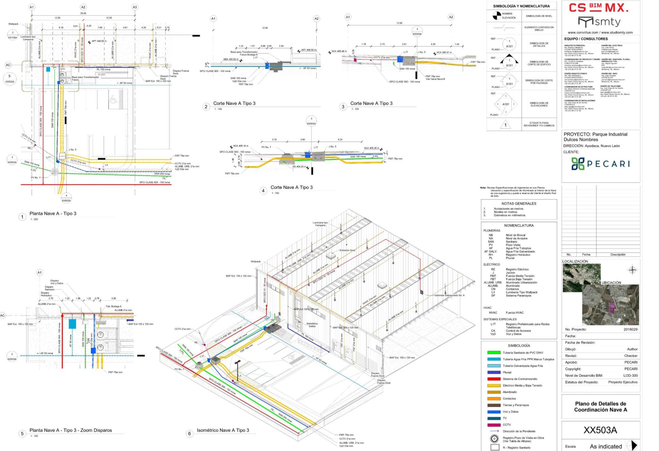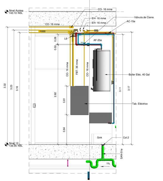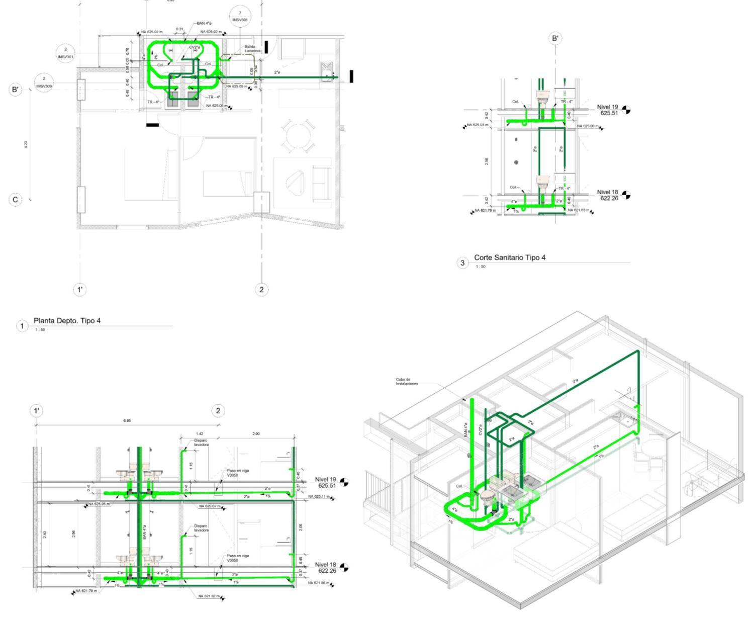 • Planta, Corte e Isométrico, Coordinación Cubo Instalaciones.