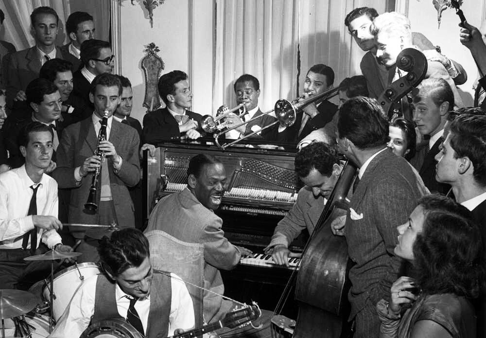 Earl Hines (piano) and Louis Armstrong (trumpet) at a 1948 jam session in Rome. They're joined by Jack Teagarden (trombone) and a host of local artists.