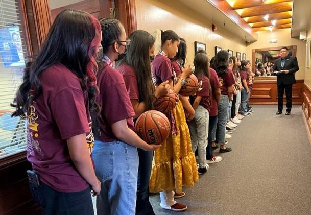 In January, the Lady Cougars were guests at the Navajo Nation State of the Union Speech. Adorned in traditional dress, they represented Tohatchi High, their community, and Gallup McKinley County schools with grace and dignity. President Nygren and First Lady BlackwaterNygren are avid supporters of basketball. The First Family often attends games throughout the Navajo Nation. First Lady Blackwater-Nygren said. “I can see how basketball has positively impacted young women across the Navajo Nation. The game teaches discipline, the importance of physical fitness, endurance, and confidence. They will remember these lifelong skills for the rest of their lives.” She went on to talk about how playing basketball can help players prepare for the challenges they face: “I am proud of the young women who have committed to play basketball. It is something the Navajo Nation has come to be known for. I can see young women’s intense pressure while performing in front of thousands of fans, their yelling parents, and sometimes unfair referee calls. We will continue to support our young athletes.”