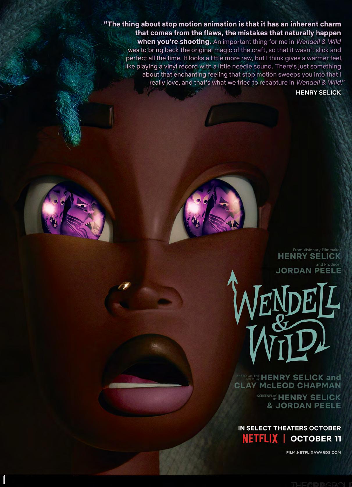 t might be 79 degrees outside in L.A., but we know fall is kicking into high gear as the studios begin to open up their bags of precious award season fare and festival gems. Our cover story this month is none other than the Netflix release Wendell & Wild, Henry Selick’s long-awaited follow-up to his 2009 stop-motion classic Coraline. Selick, who has been working in the toon business since the days of The Fox and the Hound and Who Framed Roger Rabbit, is the rare kind of artist who is loved and respected by both diehard fans and general audiences who discovered him with his stop-motion epics The Night mare Before Christmas and James and the Giant Peach. His latest effort also incorporates the talents of Jordan Peele, who has quickly become one of the most innovative masters of the horror genre after directing three stylish films. What we have is one of the most original ani mated offerings of a year rich with titles that take a chance and push the limits of the genre with gusto.