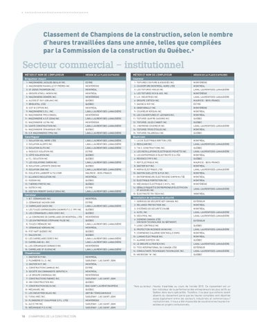 *Avis au lecteur : Heures travaillées au cours de l’année 2010. Ce classement est un bon indicateur de la performance des entrepreneurs les plus actifs au Québec dans leurs spécialités. Toutefois, il se peut que certains soient absents du classement parce que les heures compilées sont réparties assez également entre les secteurs industriels et commerciaux / institutionnels. Il nous a été impossible de soustraire les heures travaillées en projets institutionnels.