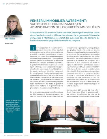 e développement de nouvelles connais- sances en immobilier et leur transfert en innovation, que ce soit en administration de propriété, en gestion immobilière ou en inves tissement, ont connu de grandes avancées au cours des 25 dernières années. On a longtemps confondu gestion d’un immeuble et gestion de bâtiment. Ce n’est plus la réalité d’aujourd’hui : la gestion immobilière est devenue une science à part entière qui exige l’adoption d’une appro che globale, systémique et pluridisciplinaire. On peut maintenant identifier clairement les connaissances, fonctions et compétences reliées à l’administration d’une propriété immo bilière. Celles-ci ont permis de mettre au point de nouvelles compétences et formations qui ont contribué à l’enrichissement des pratiques et à la transformation des modes de gestion et des modèles d’affaires et de gouvernance des propriétaires et gestionnaires immobiliers.