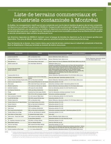 Liste de terrains commerciaux et industriels contaminés à Montréal Au Québec, les renseignements relatifs aux terrains contaminés sont inscrits dans le Système de gestion des terrains contaminés. Ce répertoire non exhaustif est géré par le MDDELCC. Puisque la LQE ne prévoit pas l’obligation de déclarer au Ministère tous les terrains présentant une contamination au Québec, le répertoire ne constitue donc pas un inventaire exhaustif des terrains contaminés dans la province. Le registre foncier représente une autre source possible, puisque les propriétaires doivent y publier un avis de contamination dans certains cas prévus par la Loi. Les directions régionales du MDDELCC mettent à jour la banque de données du répertoire au fur et à mesure qu’elles sont disponibles. Pour plus de détails : www.mddelcc.gouv.qc.ca/sol/terrains/terrains-contamines/recherche.asp. Pour les besoins de ce dossier, nous n’avons retenu que la liste de terrains commerciaux et industriels contaminés à Montréal, dont la réhabilitation n’était pas terminée au moment de mettre sous presse.