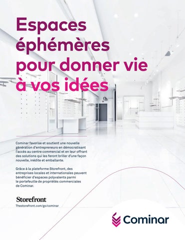 Espaces éphémères pour donner vie à vos idées Cominar favorise et soutient une nouvelle génération d’entrepreneurs en démocratisant l’accès au centre commercial et en leur offrant des solutions qui les feront briller d’une façon nouvelle, inédite et emballante. Grâce à la plateforme Storefront, des entreprises locales et internationales peuvent bénéficier d’espaces polyvalents parmi le portefeuille de propriétés commerciales de Cominar.