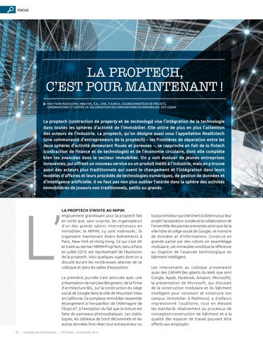 LA PROPTECH S’INVITE AU MIPIM engouement grandissant pour la proptech fait en sorte que, sans surprise, les organisateurs d’un des grands salons internationaux en immobilier, le MIPIM, s’y sont intéressés ; ils organisent maintenant divers événements à Paris, New York et Hong Kong. Ce qui s’est dit et traité au dernier MIPIM PropTech, tenu à Paris en juillet 2019, est représentatif de l’évolution de la proptech. Voici quelques sujets dont on a discuté durant les nombreuses séances de ce colloque et dans les salles d’exposition. La première journée s’est amorcée avec une présentation de Kai-Uwe Bergmann, de la firme d’architecture BIG, sur la construction du siège social de Google dans la ville de Mountain View en Californie. Ce complexe immobilier ressemble étrangement à l’ex-pavillon de l’Allemagne de l’Expo 67, à l’exception du fait que la toiture est faite de panneaux photovoltaïques. Les statis tiques, les tableaux de bord décisionnels et les autres données font rêver tout entrepreneur ou