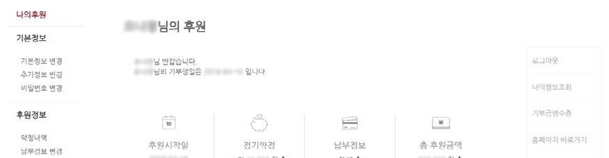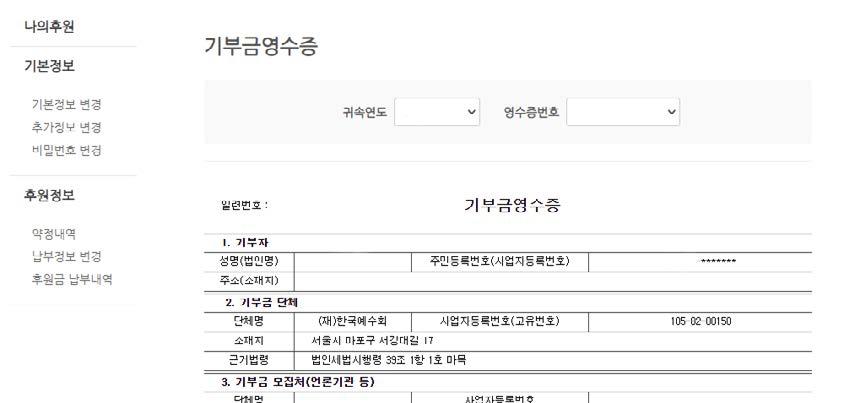 * 가입시 기부금 영수증 우편수신을 신청한 회원은 매 년 1월 중순에 우편으로 기부금 영수증을 보내드립니다.