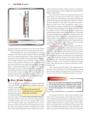 he brake disc or rotor is the main rotating component T of the disc brake unit. The wheel is bolted to the rotor and they rotate together, leading some manufacturers to integrate the anti-lock brake system (ABS) tone wheel Technician Tips provide realinto the rotor. Since friction between the rotor and brake world advice from experienced pads generates great amounts of heat, rotors must be able automotive technicians. to withstand high temperatures. The pads are also forced onto the surface of the rotor with potentially thousands of pounds of force, so the rotor must be strong and have a durable surface. The rotors are usually made of cast iron. To reduce weight, some manufacturers use a twopart rotor with a cast iron disc and a stamped steel center hat. This style of rotor is called a composite rotor. Some heavy-duty and/or high-performance vehicles have rotors