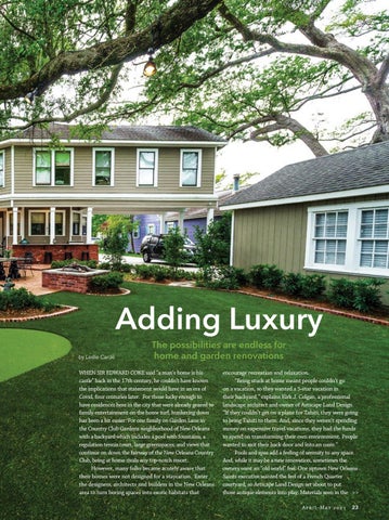 encourage recreation and relaxation. “Being stuck at home meant people couldn’t go on a vacation, so they wanted a 5-star vacation in their backyard,” explains Kirk J. Colgan, a professional landscape architect and owner of Artscape Land Design. “If they couldn’t get on a plane for Tahiti, they were going to bring Tahiti to them. And, since they weren’t spending money on expensive travel vacations, they had the funds to spend on transforming their own environment. People wanted to exit their back door and into an oasis.” Pools and spas add a feeling of serenity to any space. And, while it may be a new renovation, sometimes the owners want an “old world” feel. One uptown New Orleans Saints executive wanted the feel of a French Quarter courtyard, so Artscape Land Design set about to put those antique elements into play. Materials seen in the >> A p ri l - M ay 2 0 21