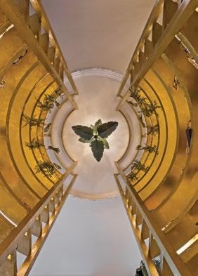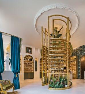 With a goal to raise the bar for optical design around the country from bland and clinical to edgy and eye-catching, JL Designs knew it had its work cut out for it. “Dr. Agnew wanted the space to reflect the historic charm of traditional New Orleans while also mixing a few unexpected modern elements for an added edge,” Jacquelyn says. “With that in mind, we incorporated glass feather chandeliers down the center of the hallway, alluding to Mardi Gras headpieces. A handmade plaster ceiling ring frames the 14-foot-tall brass atrium that celebrates the delicacy of traditional plaster moldings often seen in historic mansions on St. Charles.” The beloved bird wallpaper and purple wall panel that frames the Eye Wares logo nods to the traditional Mardi Gras colors of purple, green, and gold.
