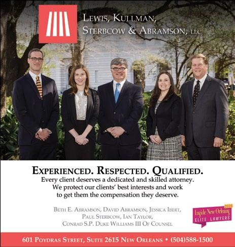 Alan R. Davis, Destinee F. Ramos Adeliaida J. Ferchmin, Nathan P. Horner, Benjamin W. Kadden, Stewart F. Peck, Samuel J. Riccardi, David B Sharpe, Alec W. Szczechowski, Rodger Wheaton; Lugenbuhl, Wheaton, Peck, Rankin, 601 Poydras St., Suite 2775, New Orleans, 504-568-1990 lawla.com