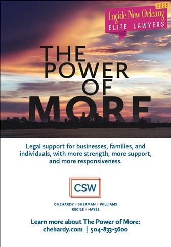 Thomas P. Anzelmo; Polly Finley Barr; Matthew Z. Clute; Quincy T. Crochet; Isidro Rene’ DeRojas; Devin Fadaol; Craig J. Hebert; Christopher David James-Lomax; Steven M. Lozes; P. Sinnott Martin; Burgess E. McCranie, Jr.; Michael R. Sistrunk; Lauren A. Welch; Briana E. Whetstone; McCranie, Sistrunk, Anzelmo, Hardy, McDaniel & Welch, LLC 909 Poydras St., Suite 1000, New Orleans, 504-831-0946 mcsalaw.com
