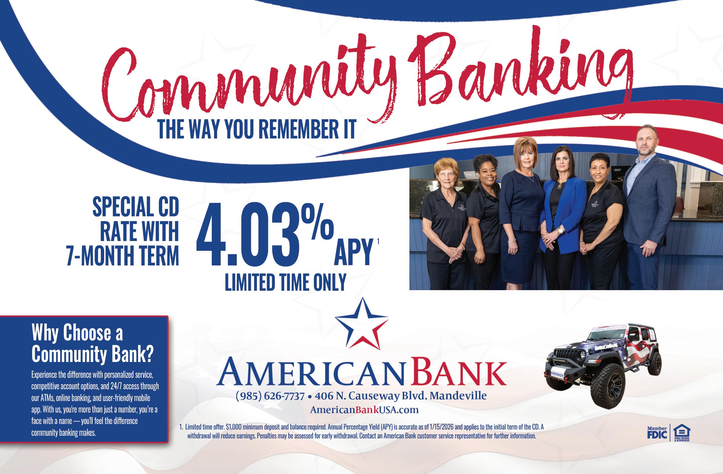 In uncertain times, a well-structured CD ladder is a simple, disciplined way to keep your savings growing with confidence. Please let me answer any questions you have, or help get your ladder up and running. You can catch me at The Reminding over coffee or call me at 985-208-3664 at the Mandeville office of American Bank.