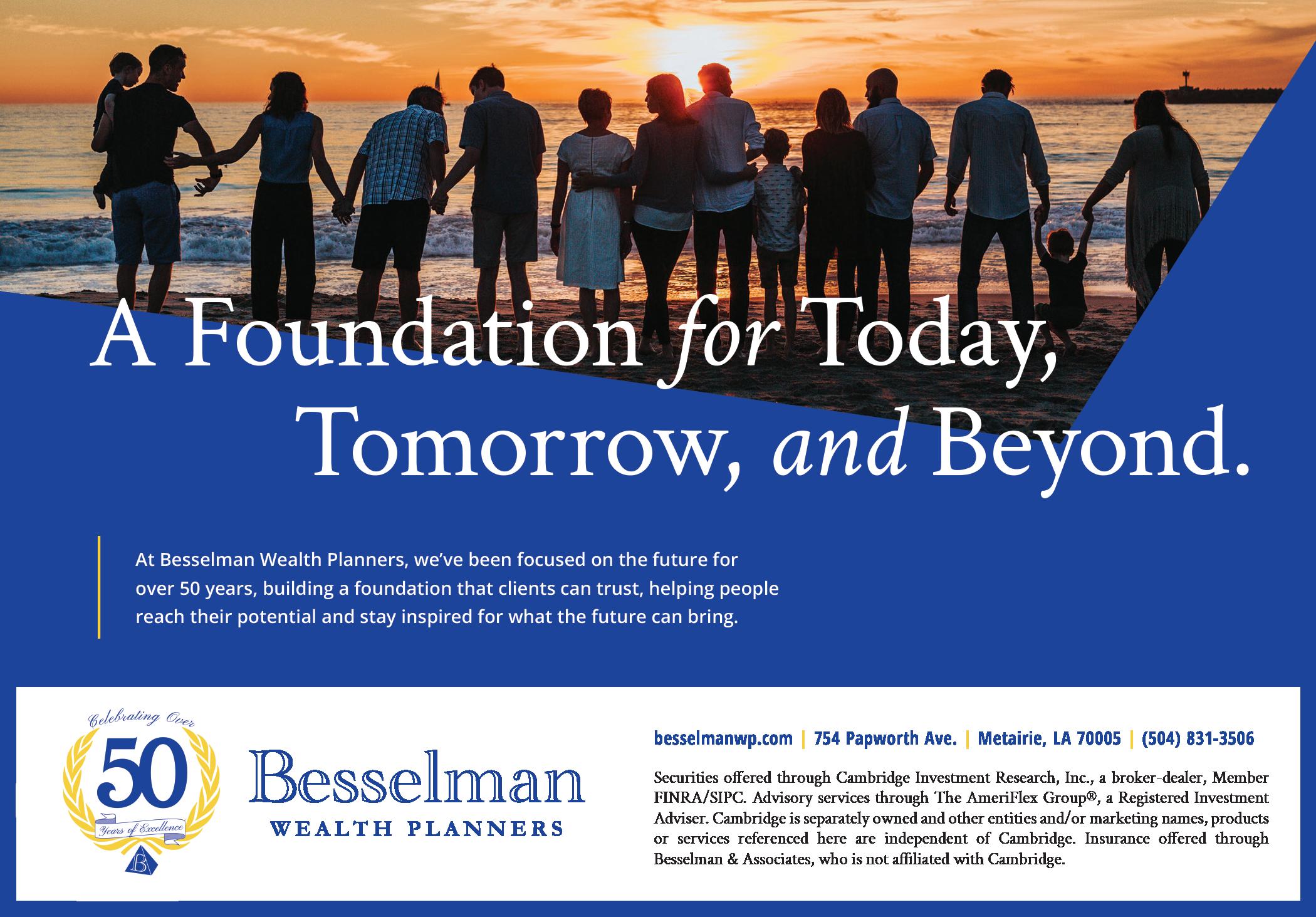 For half a century, Besselman Wealth Planners has provided thoughtful, relationship -driven financial planning to individuals, families, and businesses across the Gulf South. Founded in 1973 by James Besselman, Sr., the firm was built on a simple but powerful philosophy: focus on people, not just numbers. Today, that legacy continues under the leadership of Patricia Besselman-Main, CFP®, who remains committed to the same clientfirst values that sparked the company’s success five decades ago.