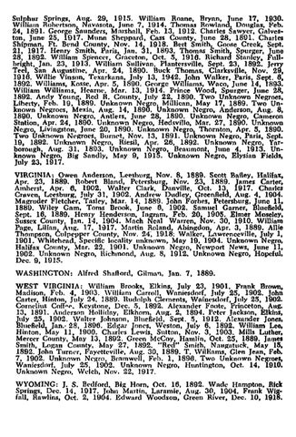 Teel San Augustine. Apr. 24, 1890. Buck Thomas. Clarksville, Nov. 29, 1916. Willie Vinsnn, Tt>xnrkllnR. Jnly 13. 1942. John Wnlker, Paris, Sept. 6, 1892. Williams, Kosse, Apr. 5, 1890. G(>orge Williams, Waco, June 14, 1893. William Williams, H<.'fUnl', Mor. 13. 1914. Prince Wood, Spurger, June 28. 1892. Andy Young, ned R. County, July 22. 1890. Two Unknown Negroes, Libetty, Feb. 19, 1889. Unknown N('gro Millican, May 17, 1889. Two Unknown Nt'groes, Mexia, Aug. 14, 1890. Unknown Negro. Anderson, Aug. 8, 1890. Unknown NeJero, Antlers, J\1nt' 28, 1890. Unknown Negro, Cameron Stntion, Apr. 24, 1890. Unknown Negro, HedsviHo, Mar. 27, 1890. Unknown Negl'O, Livingston, June 20, 1890. Unknown Negro Thornton, Apr. 5, 1890. Two Unknown N('grol's, Burn(·t, Nov. 13, 1891. Unknown Negro, Paris, Sept. 19, 1892. Unknown Negro, Riesil. Apr. 26. 1892. Unknown Negro, Yarborough, Aug. 31, 1893. Unknown N('gro, Bt'numont, June 4, 1913. Unknown Negro, Big Snndly, Mny 9, 1915. Unknown Negro, ElysinD Fields, July 23, 1917. VIRGINIA: Owen Anderson, Leesburg, Nov. 8, 1889. Scott Bailey. Halifax, Apr. 23, 1889. Robert Bland, P('h'rsburg, Nov. 23, 1889. lames Carter, Amherst, Apr. 6, 1902. Walter Clark, Danville, Oct. 13 917. Charles Crllvcn. Leesburg, July 31, 1902. Andrew Dudley, Greenfleld, Aug. 4, 1904. Milgruder Fletcht'r, Tasley. Mar. 14. 1889. John Forbes. Petersburg, June 11. 1889. Wiley Gam, Toms Brook. June 6, 1902. Samuel Gamer, Blue8eld, Sept. 16. 1889. H~nry H€'nderson. Ingram~ Feb. 201 .1905. Elmer Moseley, Sussex County, Jan. 14, 1904. Mach Neal Warren. NOV. 30. 1910. William Page, Lilian Aug. 17, hH7. !'o.1nrtin Roland, Abingdon. Apr. 3, 1889. Allie Thompson, Culp('}>per County, Nov. 24', 1918: Walker, Lawrenceville, July 1, 1901. Whitehead, Specific locality unknown, May 19, 1904. Unknown 'Ne~m, HaliEn" County. Mnr. 22, 1901. Unknown Negro, Newport News, June 11, 1902. Unknown Negro, llichmond, Aug. 8, 1912. Unknown Negro, Hopeful, Dec. 9. 1915.