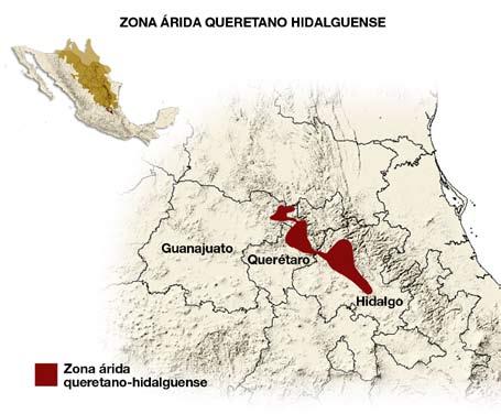 con la extensión total de esta unidad geográfica. casi invariablemente, la riqueza local en estos núcleos está determinada por las especies de distribución geográfica limitada o muy limitada; es decir, por las que son endémicas o microendémicas. así, las floras cactológicas en ciertas sub-regiones exhiben especies exclusivas que no se comparten con otras, lo que se traduce en una composición variada y única. al combinarse distintos contingentes de especies, la diversidad regional resultante es extraordinariamente alta. Por ejemplo, en el extremo sur del desierto chihuahuense existe un área que cumple con las características de los sitios de alta diversidad, la zona árida queretano-hidalguense, que aunque relativamente poco explorada, tradicionalmente ha llamado la atención de coleccionistas y cactólogos por albergar un importante número de especies endémicas, las cuales han sido objeto de saqueo y comercialización ilegal por décadas.