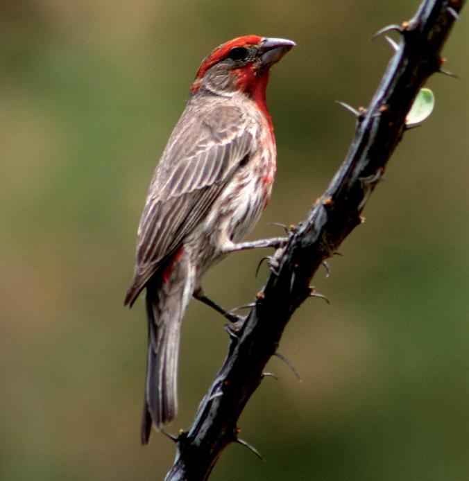 Macho: Ojos negros. Pico y patas grises. Plumaje de la cabeza, el pecho y la garganta rojos. Pequeño antifaz café. Partes inferiores blancas con rayas café oscuro. Nuca y dorso gris marrón con rayas oscuras. Alas y cola marrón oscuro con bordes de color marrón claro. Base del borde de la cola ligeramente roja. Hembra: Varía en el plumaje. La cabeza, la garganta y el pecho son café oscuro. Voz: Un chee, chieh, chie-chiet, rrea-h, nyee-ah o un corto wiet. Canto con gorjeo, variado y prolongado.