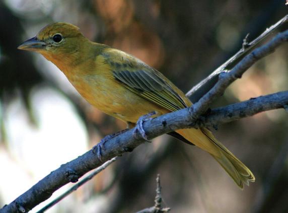 Macho: Ojos negros. Pico y patas grises. Plumaje de la cabeza, el dorso, la cola y las alas negro. Alas con bandas blancas y un tramo de borde blanco en la orilla del ala. Garganta, pecho y partes inferiores amarillas. Hembra: Varía en el plumaje, la cabeza y las partes superiores son color oliva. Las alas son más oscuras. Voz: Un zweeir, teu, ch-ch-cht o ch-cht. Su canto es variado y prolongado.
