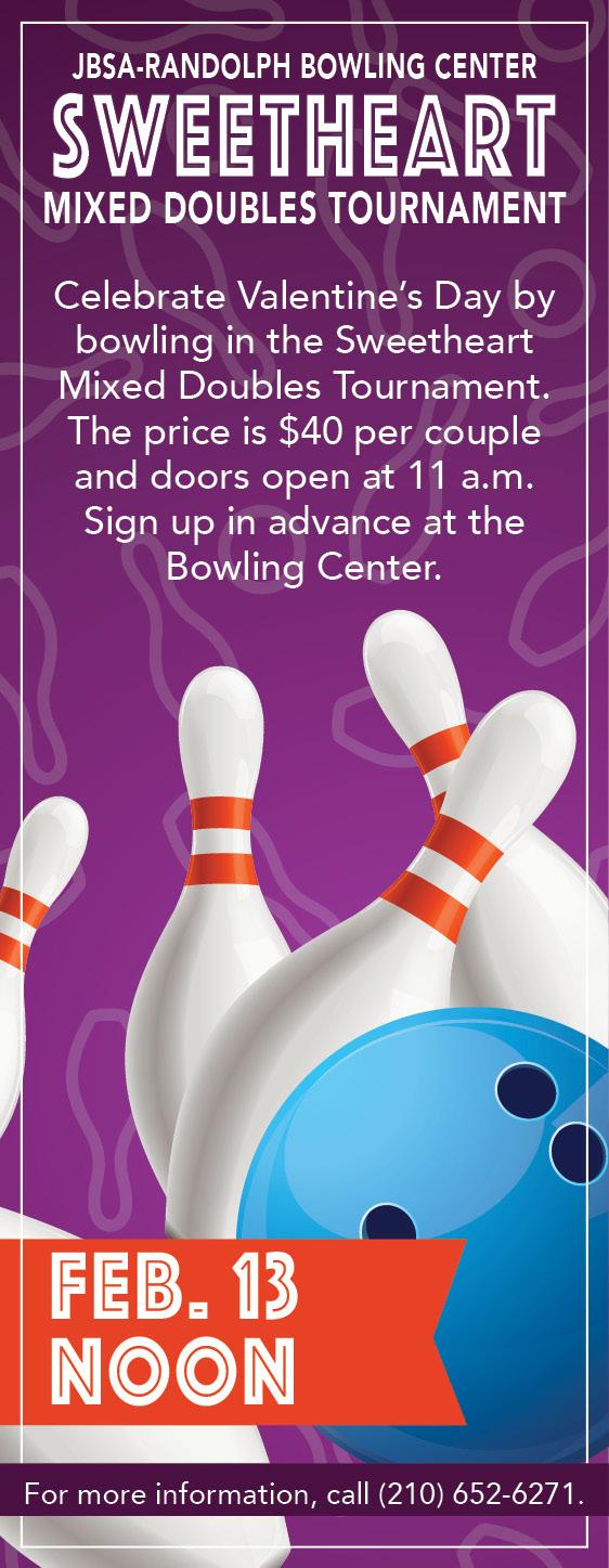 Jan. 14 • 11:30 a.m. to 6 p.m. Come out to the Randolph Bowling Center to celebrate the Martin Luther King, Jr. holiday weekend. Receive a coupon for “Bowl One Hour and Get One Hour Free” on a return visit and bowl at the special bowling rate of $20 per hour (up to six bowlers) with $3 shoe rental.
