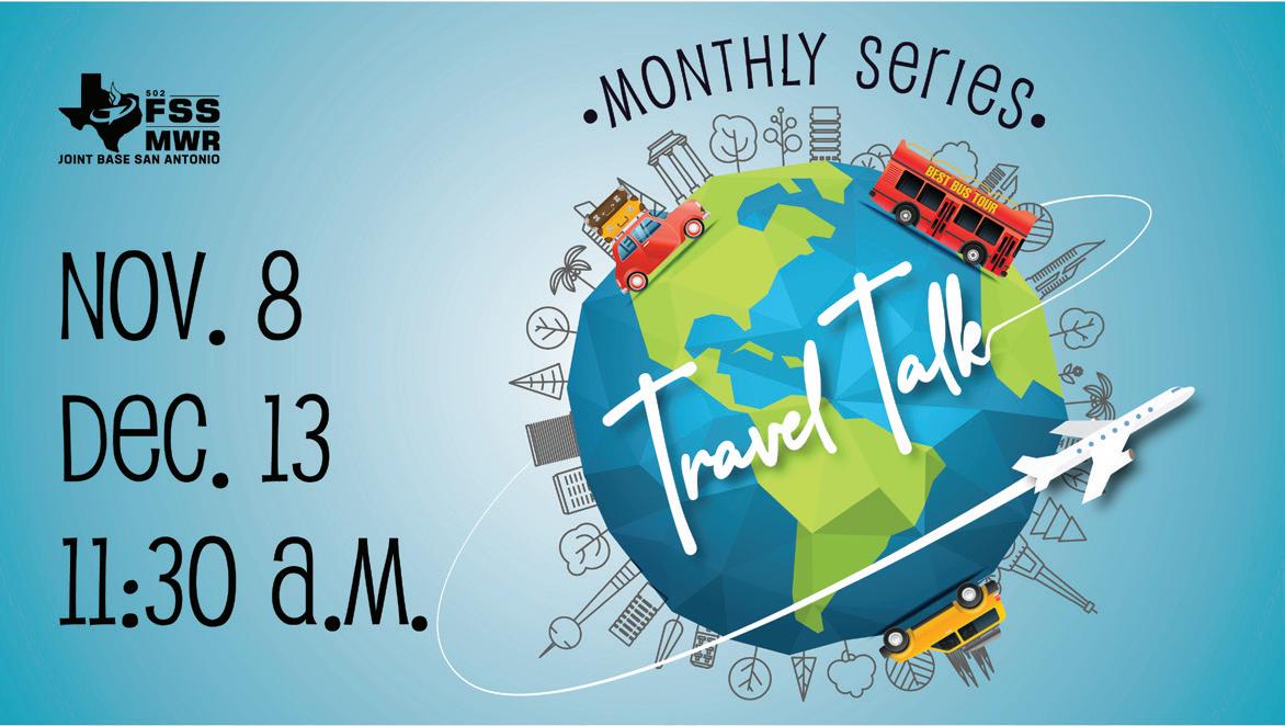 6-8 p.m. T R E E LIGH T ING JOINT BASE SAN ANTONIO 502d FORCE SUPPORT SQUADRON PRESENTS JBSA Fort Sam Houston 10:30 a.m. to noon November 19 32 5 14 & 15 25 Director, 502d Force Support Squadron Ms. Rebecca White JBSA Marketing Director Ms. Shelta Reese Chief Designer/Editor Mr. Chris Anderson If you would like to be a sponsor for an FSS event, contact one of our Commercial Sponsorship Specialists. Connie Szeszko (210) 221-2307 Al Conyers (210) 925-1187 Ed McDaniel (210) 652-2940 MARKETING OFFICES Fort Sam Houston (210) 221-2606 Randolph (210) 652-2052 The JBSAtoday magazine is created by the 502d Force Support Squadron. Contents of JBSAtoday are not necessarily the official views of, or endorsed by the U.S. Government, the Department of Defense or the Department of the Air Force. to go How to Play: Find ALL the FSS/MWR logos throughout the magazine (There’s a lot). Play the game and submit your answer to RAN502FSSMarketing@gmail.com with “Logo Hunt” in the subject line along with your first and last name in the body of the email. If you find all the logos throughout the magazine, you will be entered into a drawing to win a $25 gift card. The drawing will be held on Dec. 15 with a total of three winners who will be notified via email. FIND THE LOGOS!Harlequin Theater 28 & 29