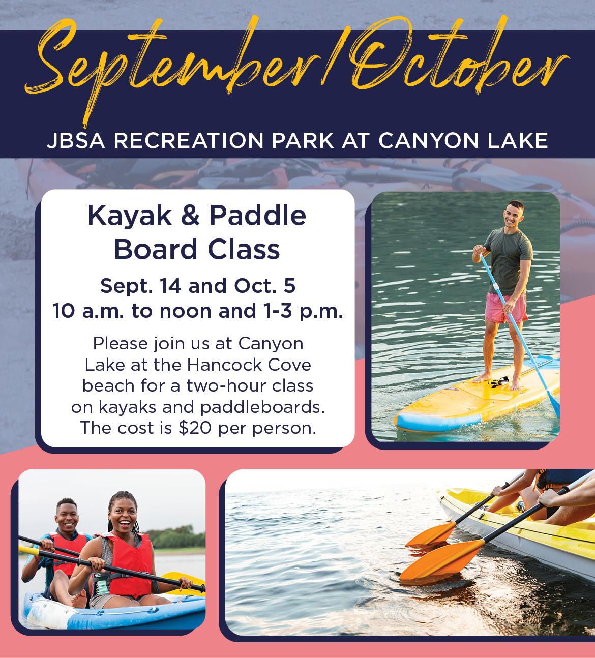 The kayak and canoe safety course is required for non-powered boating equipment. Go to www. boaterexam.com/paddling/ or patrons can watch the video at any JBSA Outdoor Recreation Center.