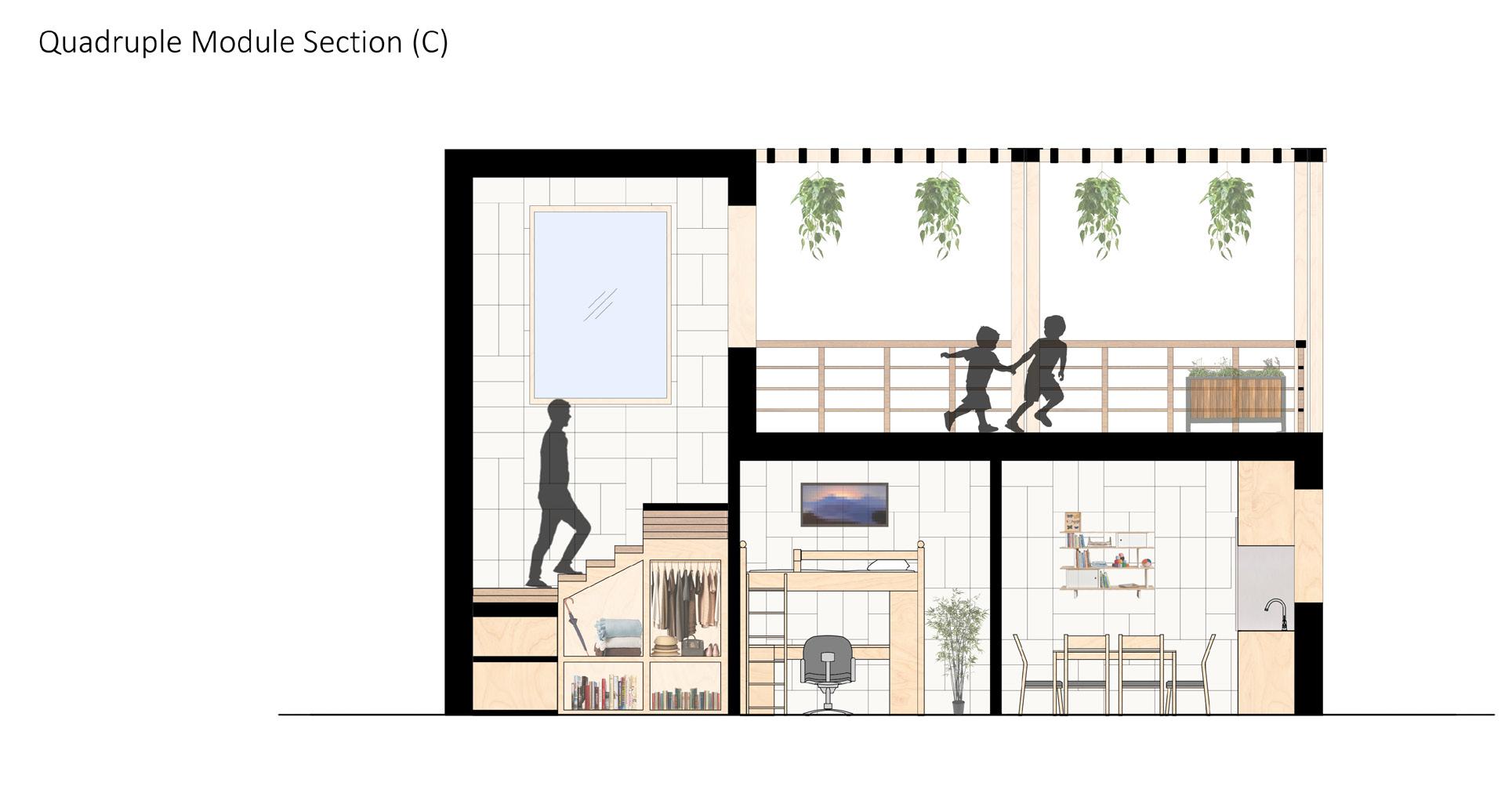Three unit sizes are provided to accomodate differing sizes of families, couples, or single occupants. The frugal nature of the units minimizes the footprint of each occupant, but still provides all necessities that occupants need. Private terrace spaces also provide occupants the ability to connect with the outdoors.