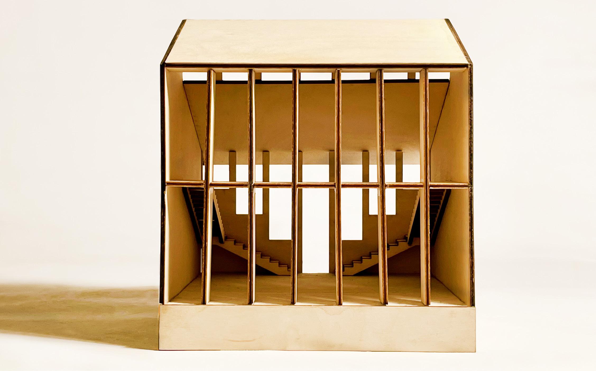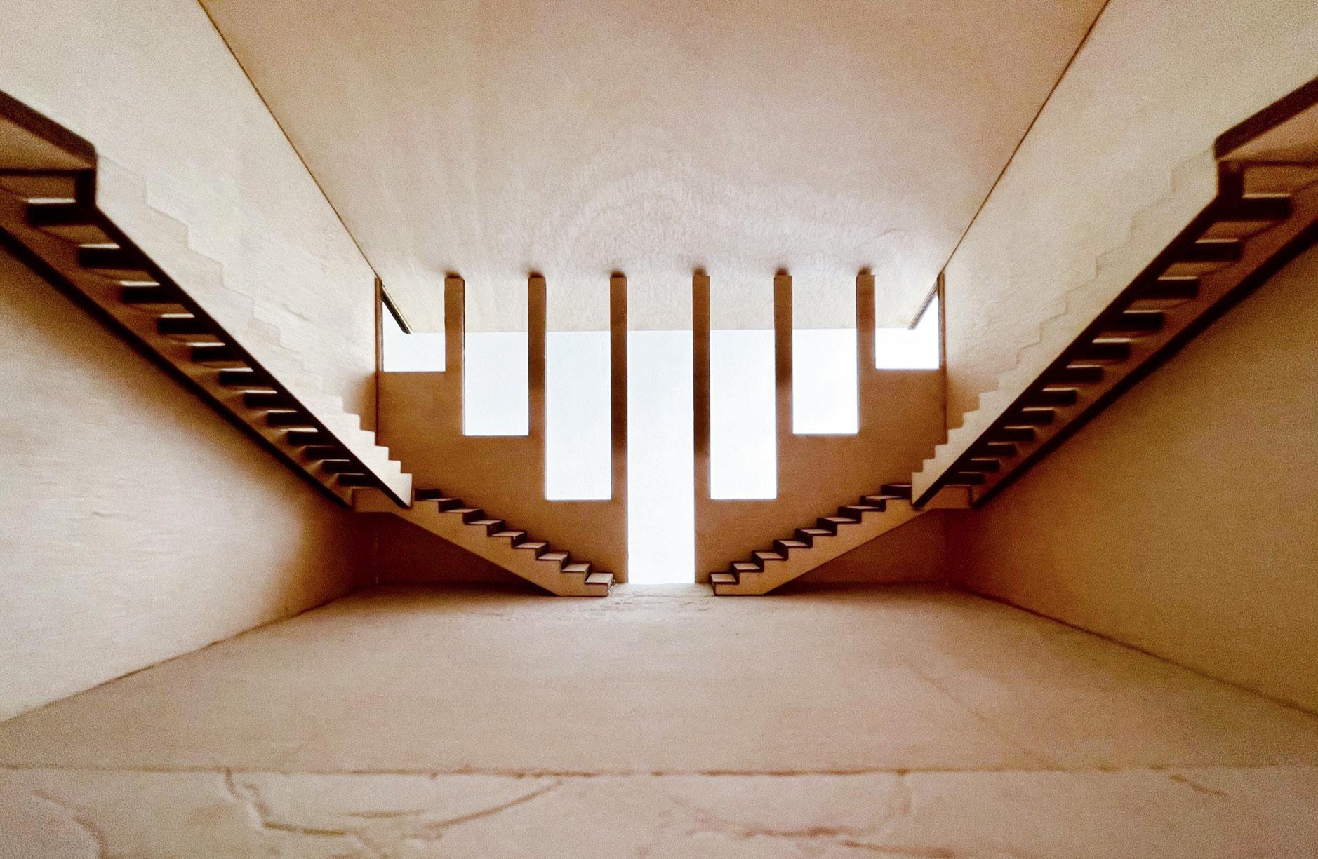 The northern facade utilizes a large windowto-wall ratio and vertical fins to allow diffuse natural lighting to enter the interior space. Overhangs cover southern-facing windows to protect the plastered floor from unwanted exposure to sunlight. A pair of symmetrical staircases provide onlookers the ability to see objects traced on the plastered floor from various heights across the floor’s entire perimeter.