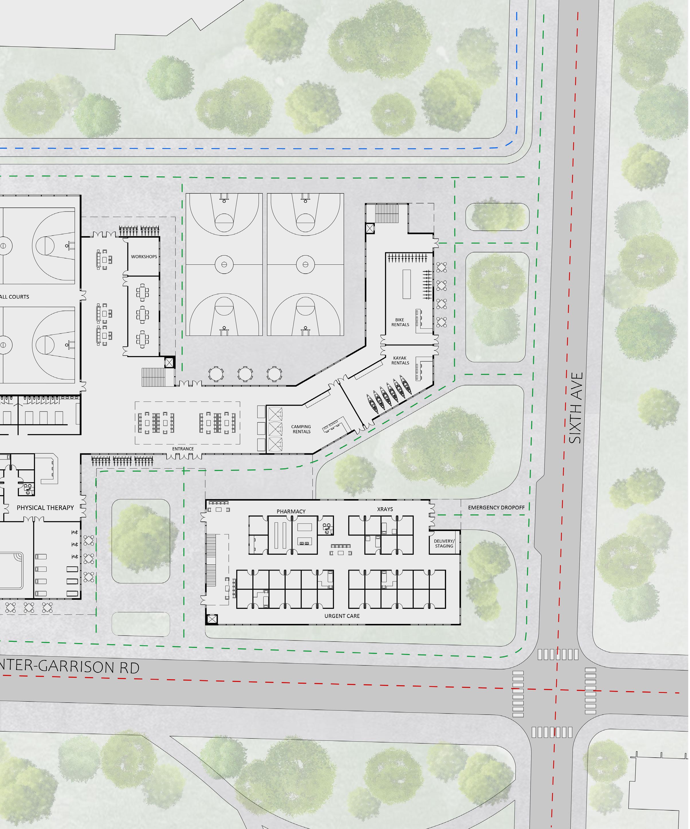 With recreational and medical spaces providing different experiences and emotional atmospheres, they are separated on the first floor but are unified on the second and third floors with mental health spaces. This serves as a literal and metaphorical bridge between different aspects of physical wellbeing. Additional space for renting outdoor recreational equipment connects students to their environmental wellness. With programs spanning from large communal spaces to smaller private rooms, the center seeks to integrate these programs in a cohesive manner that connects students to different aspects of wellness and destigmatizes healthcare and mental health services.