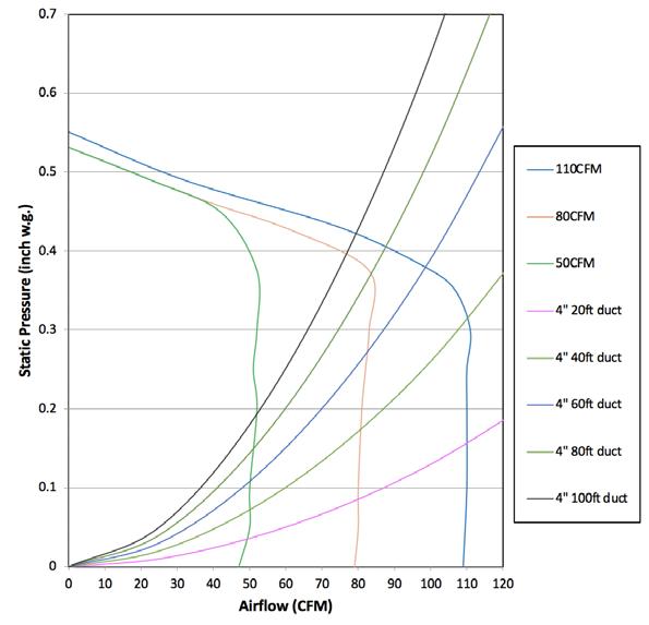 Figure A shows how a performance curve works. The fan with a “Closed Duct” has high static pressure and no airflow; and the fan with “No Duct” has low static pressure and high airflow. In reality, an installed fan will be somewhere in between these two points.