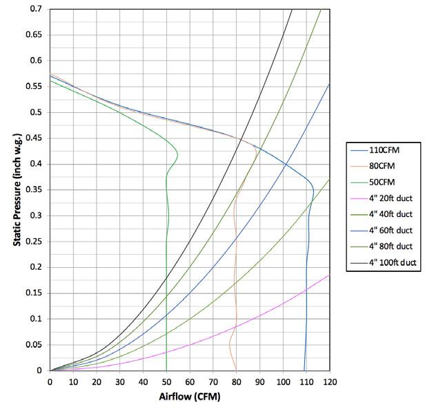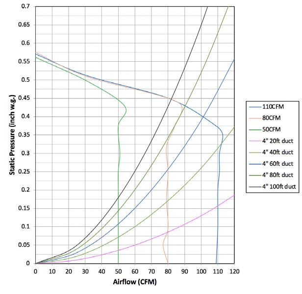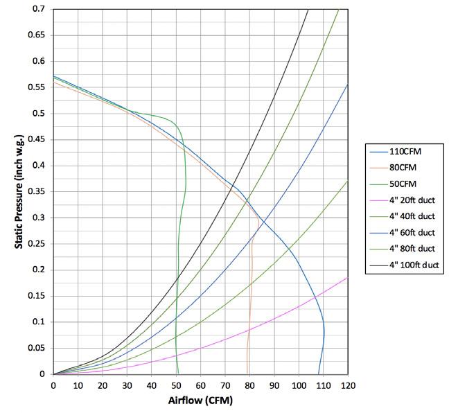 Step 6: Use the EDL calculated in Step 4 to check on the performance curve for the fan selected in Step 5. Compare your calculated EDL to the curves for different EDLs on the performance curve for your selected product. Where they cross will tell you what airflow to expect. For the 60 feet of EDL in the example, interpolate between the curve for 50 feet and the one for 75 feet.