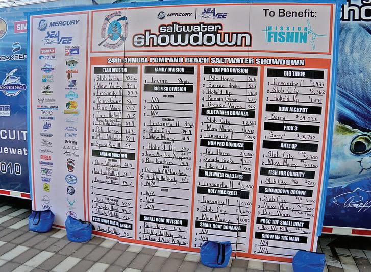 Top Teams 1st Slob City 103.6 pts $10,000 2nd Mow Money 99.1 pts$4,000 3rd Finsanity II 87.7 pts $2,000 4th Young Guns 86 pts $1,500.00 5th Blue Moon 75.7 pts $1,250.00 6th Tax Relief 71.3 pts $1,000.00 7th How Ya Reelin 67.9 pts $900.00 8th Pale Horse 61.6 pts $800.00 9th Miss Michelle 59.1 pts $700.00 10th Spiced Rum III 58 pts $600.00 Top Family Division Young Guns Top Family - Irvine 86 pts Trophy + Prize Top Species Dolphin N/A - $1,000 Kingfish Finsanity II 35 pts $1,000 Wahoo Hoke’d Up 34.2 pts $1,000 Tuna Doing It All/Hardway 17.5 pts $1,000 Cobia N/A - $1,000