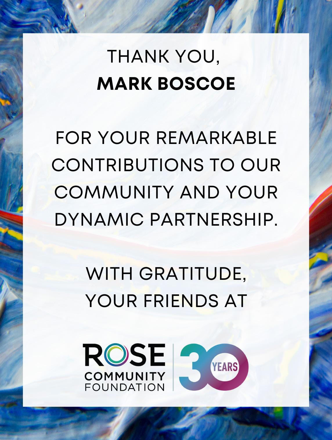 Congratulations to our dear friend Mark Boscoe. Ilene and Mike Rosen