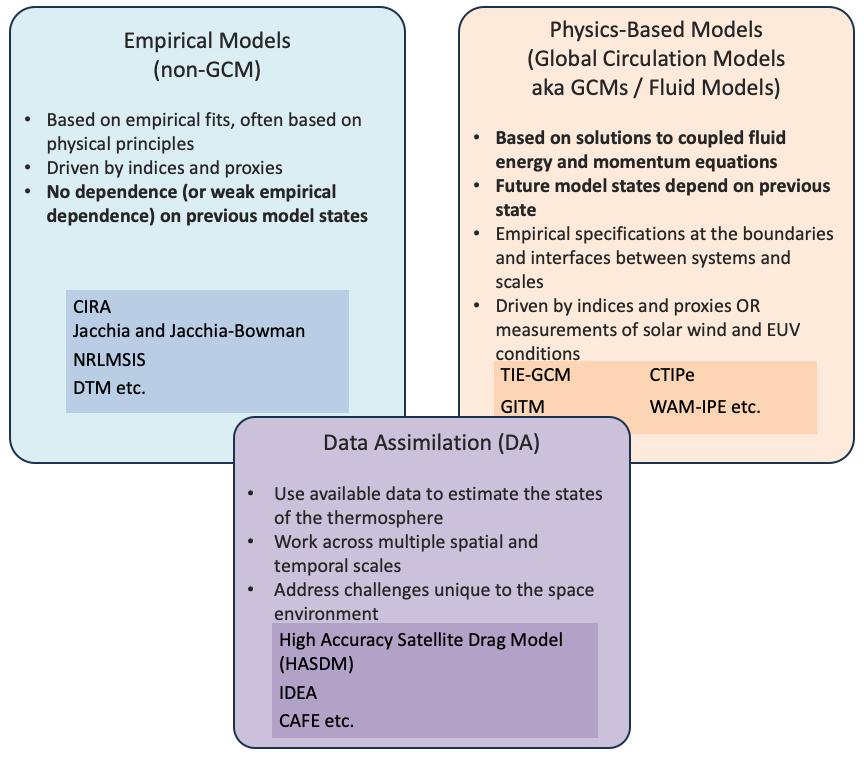 While many of the approaches above capture long-term climatological trends or qualitatively representative responses to external inputs and emergent phenomena (esp. in the case of fluidic or GCM models), their ability to reproduce day-to-day or hour-by-hour space-weather variability accurately remains elusive in the thermosphere. This is partly due to the uncertainties in the external drivers described above (solar, geomagnetic, and lower atmosphere coupling) and partly due to the inexact mapping between those drivers and the real energy input for the thermosphere. The ability of any atmospheric model to represent the state of the thermosphere given a set of ideal inputs is also a challenge. This is associated with the quality and quantity of data represented in an empirical model and the ability of a GCM to simulate the coupled physical equations in the thermosphere. One approach for addressing these challenges is the fusion of models with on-orbit data through various forms of Data Assimilation (DA).
