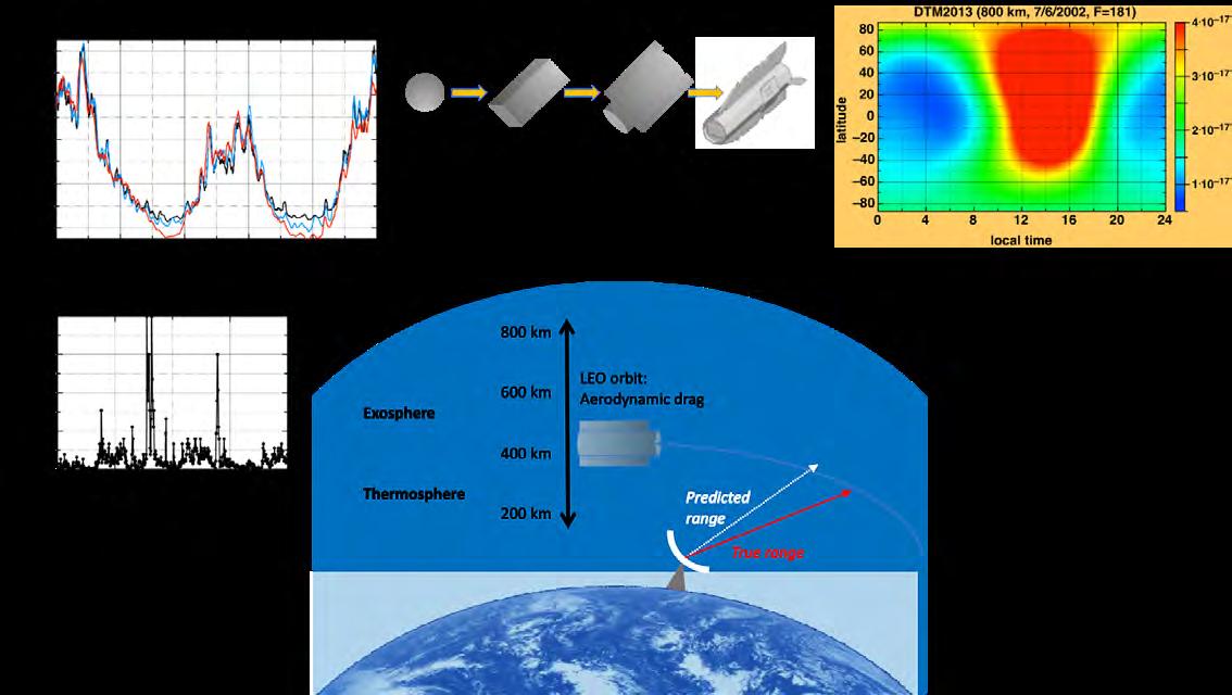 order to cover all topics that contribute to thermosphere model quality and performance, especially density data consistency and quality, and model drivers. This is schematically displayed in Figure 1, which shows the main ingredients for satellite drag calculation, i.e., for objects in Low Earth Orbit (LEO).