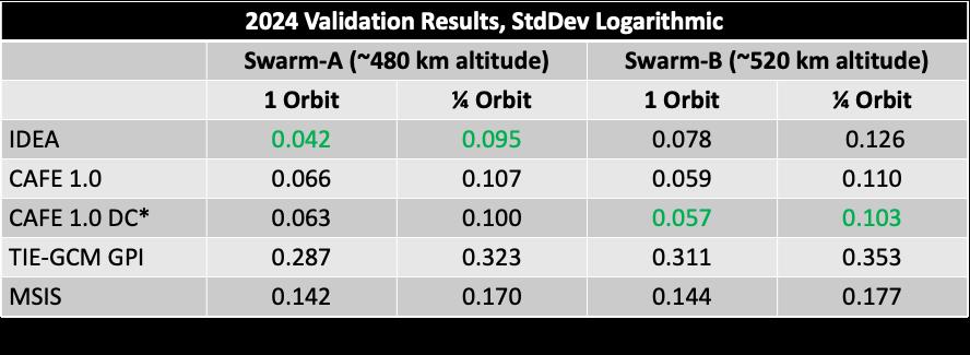 ▲ Table 1: Example of DA (IDEA and CAFE) performance compared to the respective background models (TIE-GCM and MSIS respectively). The DA reduces errors by a factor of two in this example.