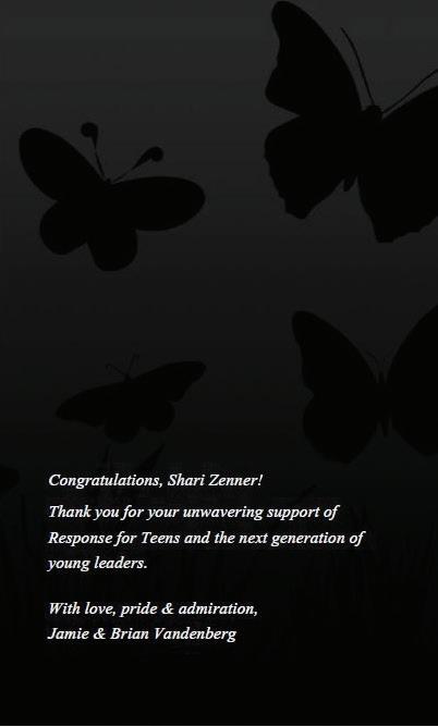 Warmest congratulations to Shari Zenner on your well-deserved honor and incredible work for Response for Teens. Julie and Jon Lewin Congratulations Jill & Shari Honey Bronson RN, FMCA 847.971.9412 honeybhealthcoach@gmail.com honeybronsonhealthcoach.com Individual Health Coaching & Corporate Wellness