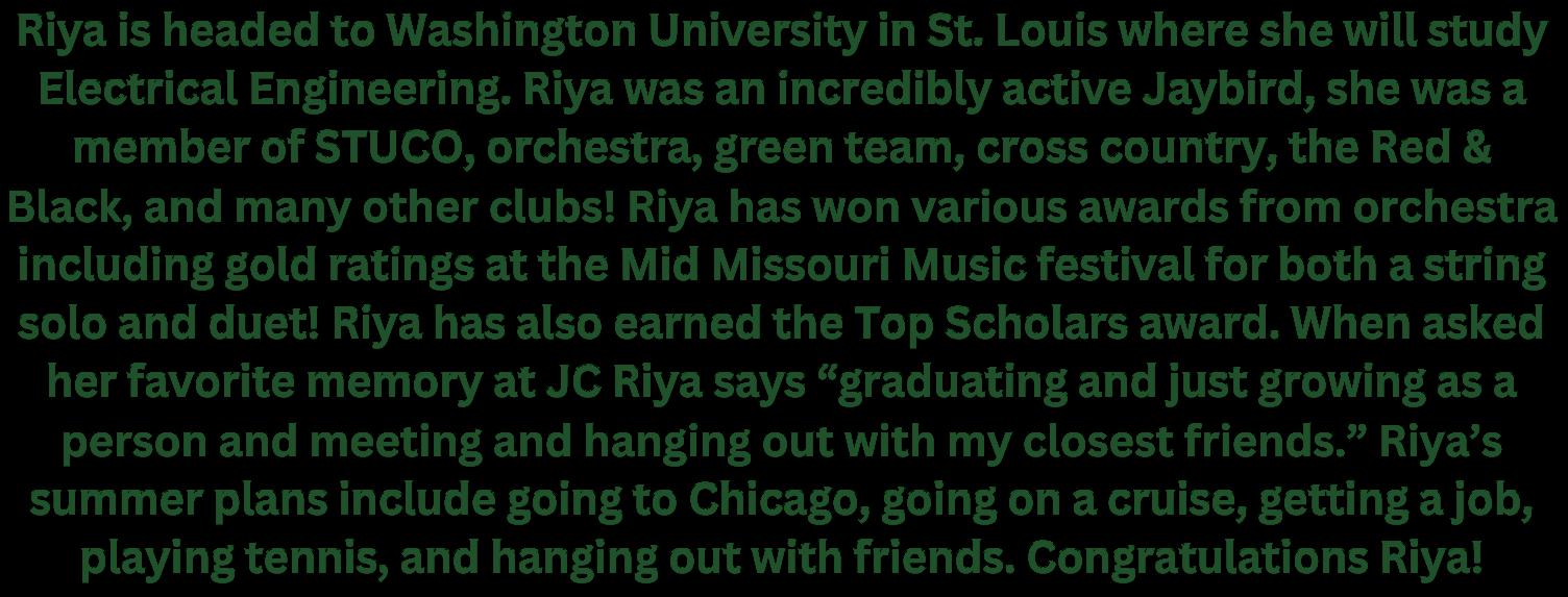 Zack is going to Washington University for computer engineering. Zack was the class of 2024 Student Body president, a member of STUCO, Green Team, Orchestra, the Red & Black paper, and Scholar Bowl. While at JC Zack earned the Top Scholars Award and the Outstanding Leadership Award. Zack says his favorite memory is āgetting into fun situations within student council, such as our worknights.ā This summer Zack plans on going on a senior trip to Chicago! Congratulations Zack!
