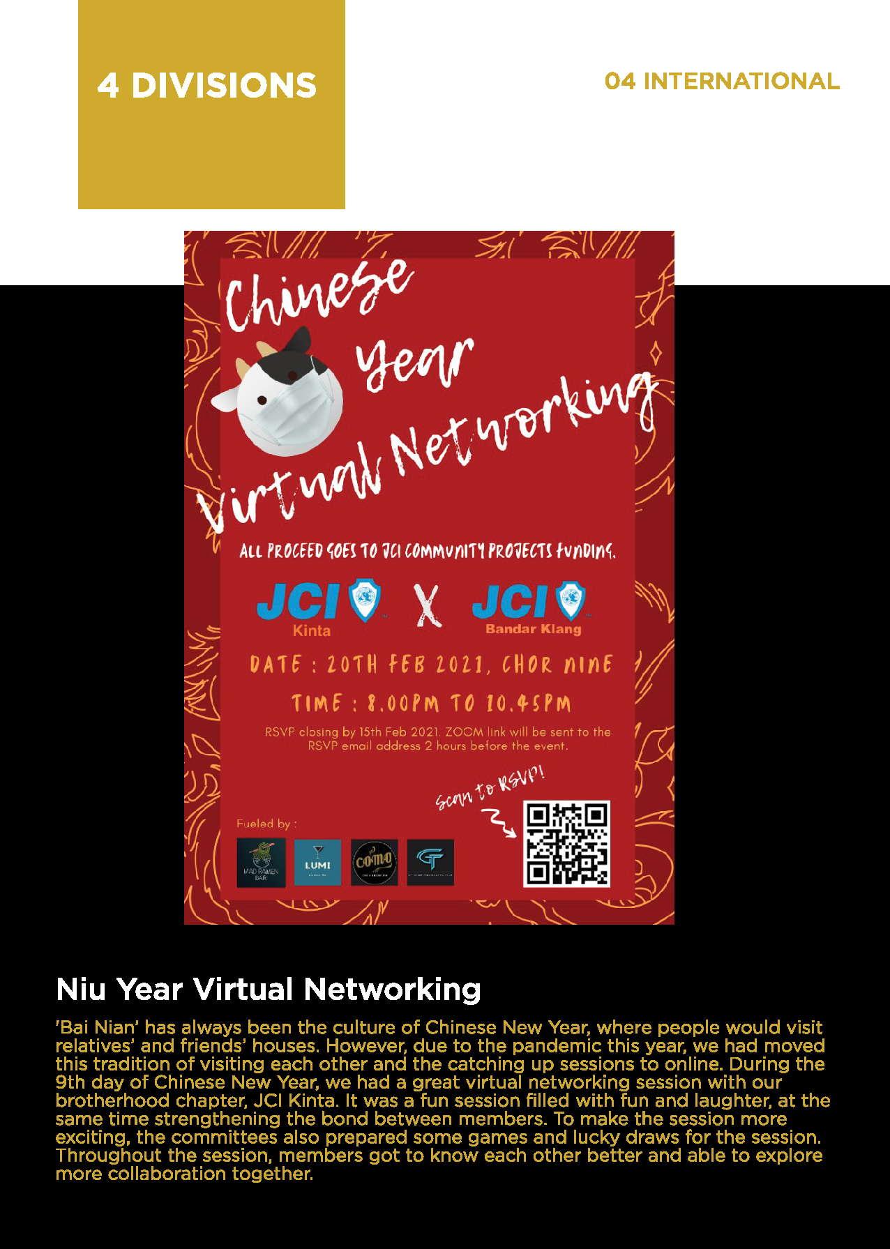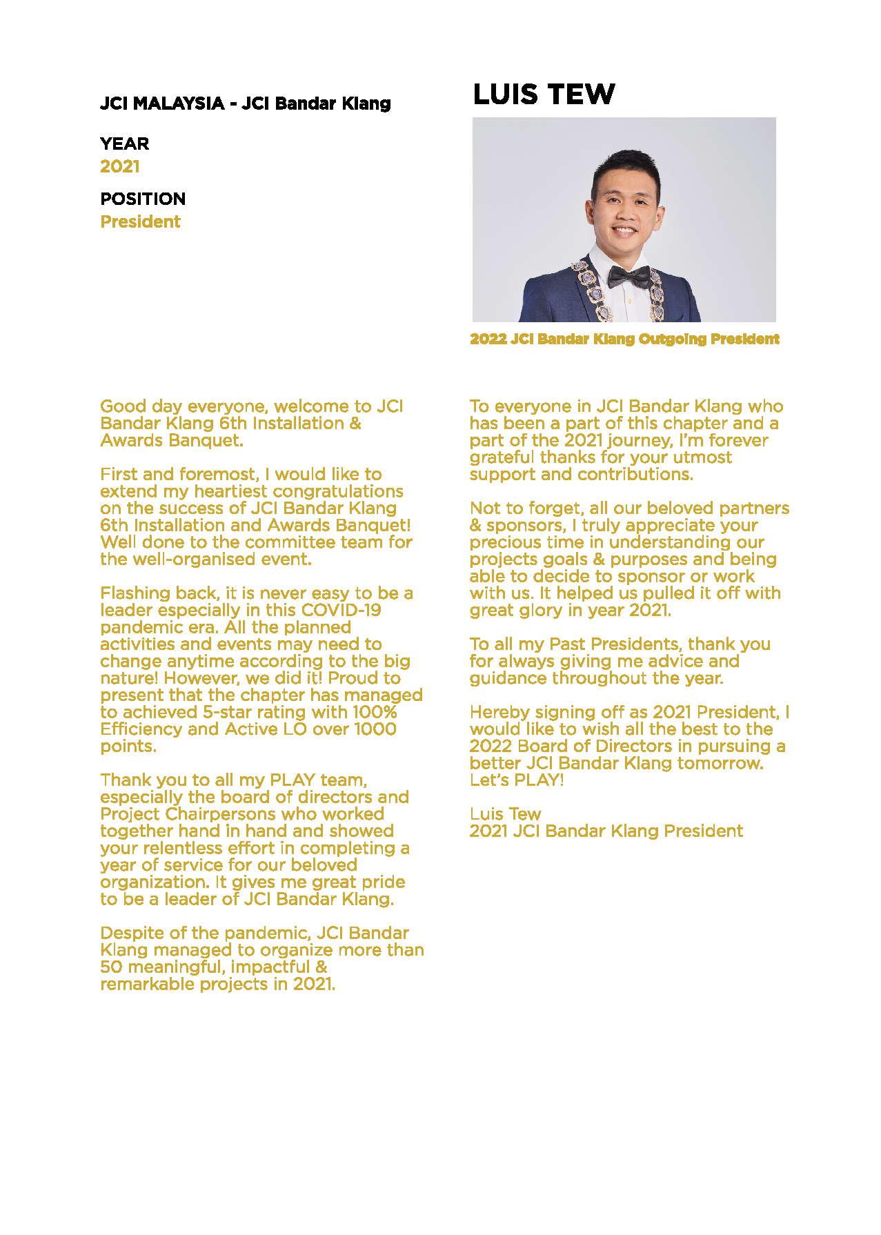 On behalf of JCI Kuala Lumpur, I would like to extend my heartiest congratulations to 2O2'l President, Luis Tew and all Board of Directors for the great success in 2021 despite the challenges faced due to the COVID-l9 pandemic.