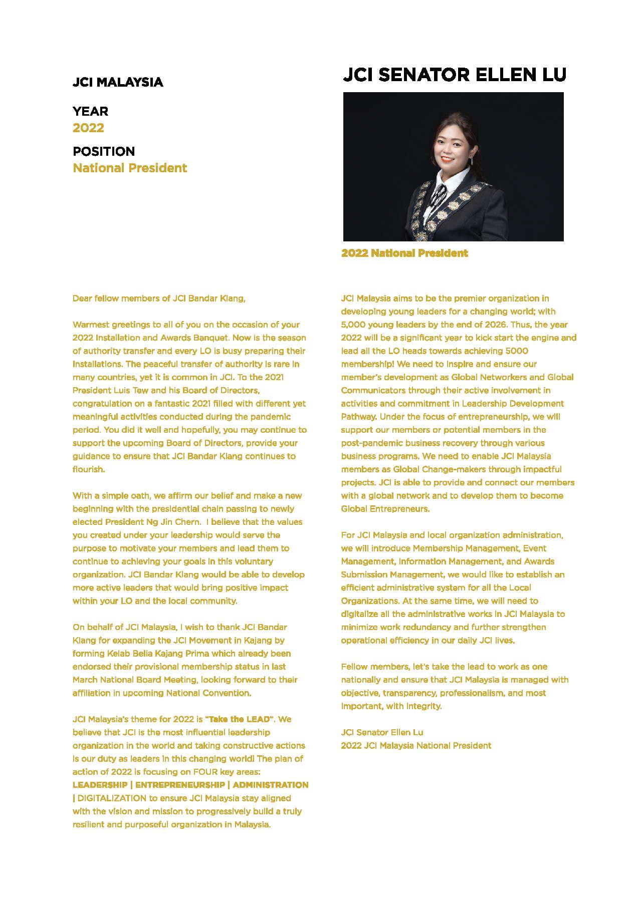 It is my great honour to be invited to pen a few words in conjunction with Junior Chamber lnternational Bandar Klang 2022lnstallation & Awards Banquet.
