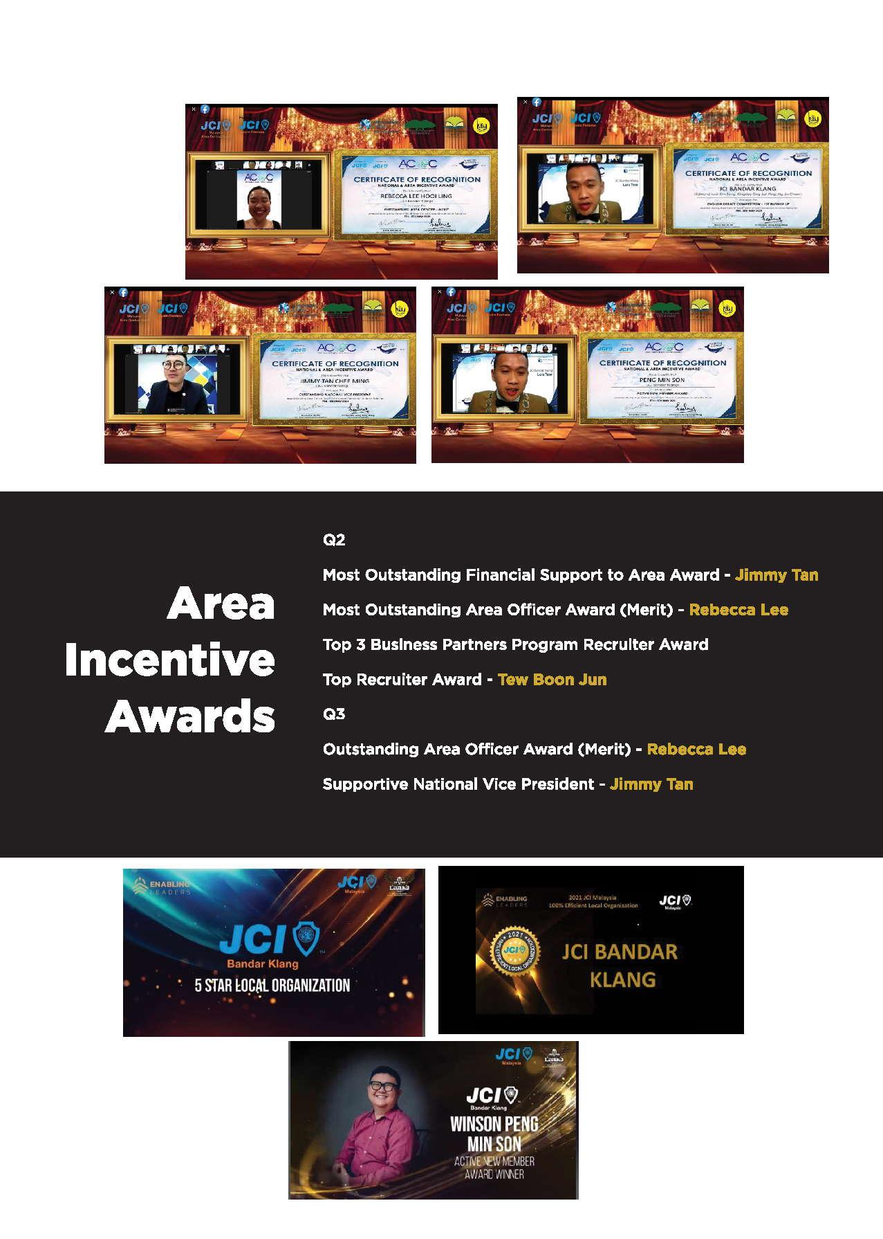 First and foremost, lwould like to extend my heartiest congratulations on the success of JCI Bandar Klang 6th lnstallation and Awards Banquet! Well done to the committee team for the well-organised event.