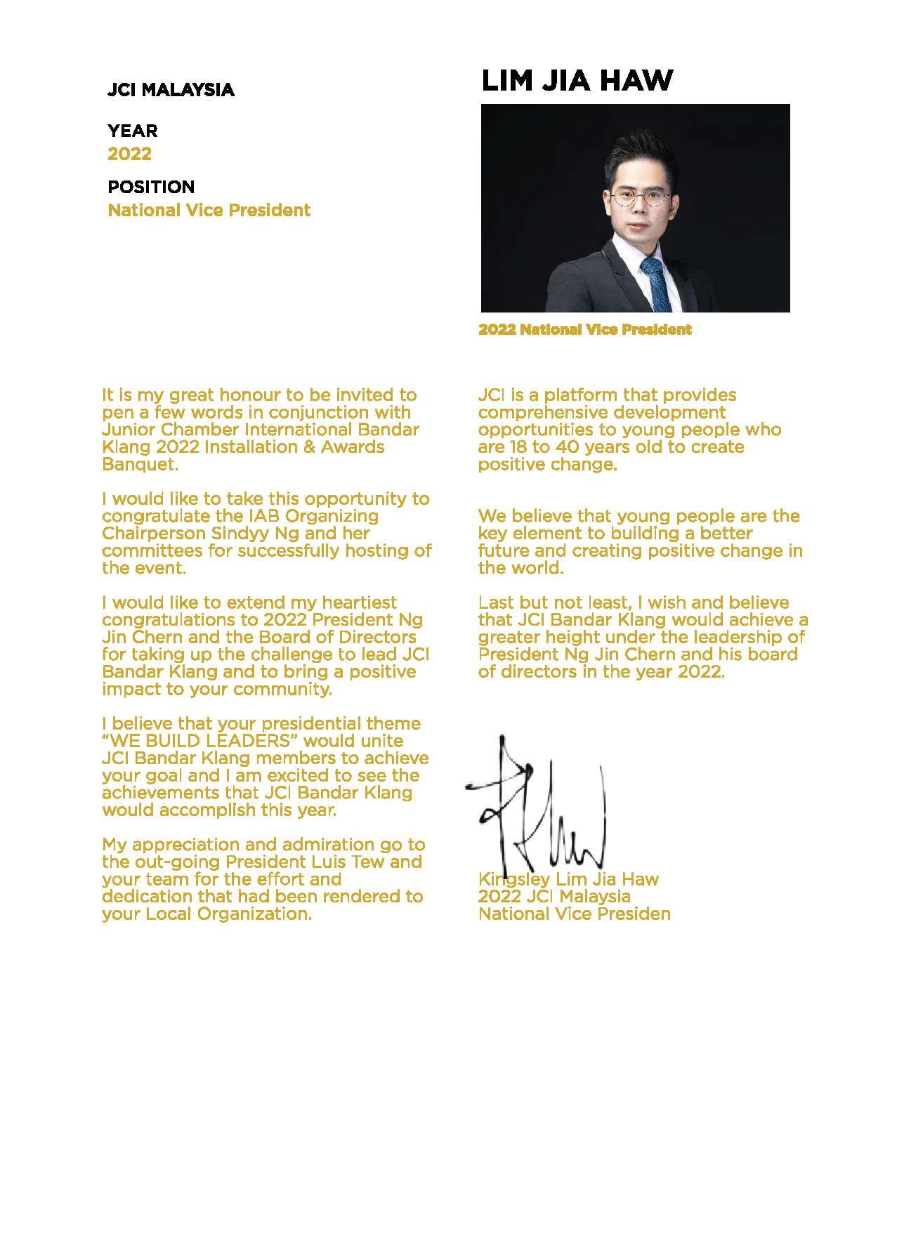 Kirigsley Lim Jia F 2022 JCI Malaysia Haw National Vice PresidenWelcome all VlPs to our Heng Ong Huat Family JCI Bandar Klang 6th lAB, wish you all enjoy the night.