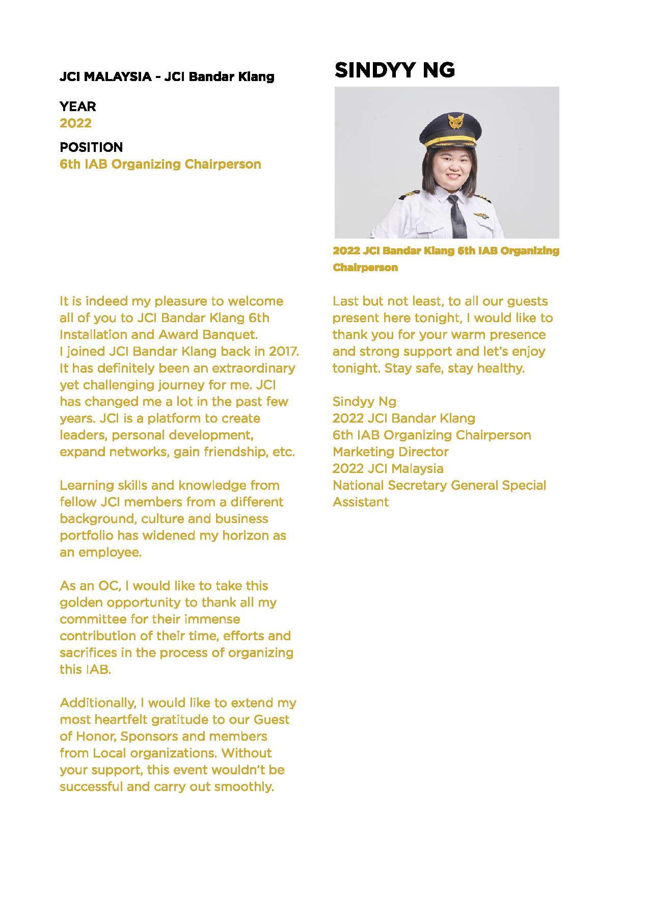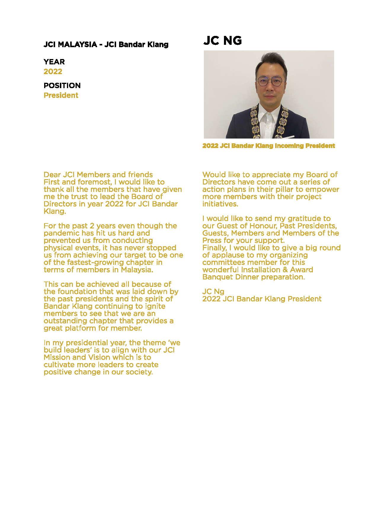 JC Ng 2022 JCI E nd.l l(rnt ln€mlnt Prrdd.m 2022 JCI Bandat Klang President MALAYSIA - JCI Kuala Lumpul Mother Chapter